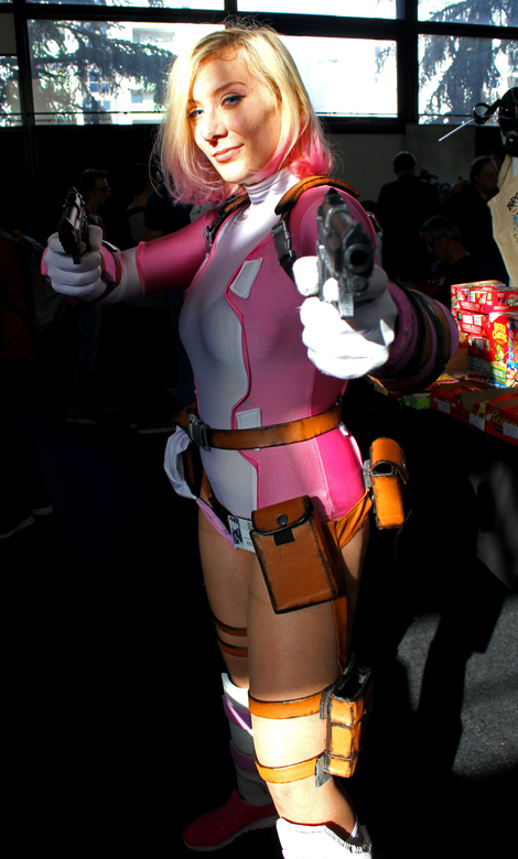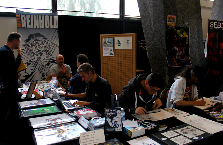 C’est donc un espace plus petit que lors des trois éditions précédentes que l’évènement se déroulait ce week-end. Plus petit, oui, mais qui permettait de réintégrer tous les artistes dans un même hall, qu’ils appartiennent à ce qu’il est convenu de qualifier d’Artist Alley ou qu’il s’agisse de dessinateurs travaillant couramment pour Marvel, DC Comics ou Valiant, le tout laissant aussi de la place à des micro-éditeurs comme Northstar Comics, l’association Comics Art Cards, l’équipe de Non?Si, les superviseurs du livre Kirby And Me ou d’autres encore. Au gré des tables on réunissait donc des signatures telles que Paul Renaud et Daniel Acuna (dessinateurs alternant encore récemment sur les aventures de Captain America), Alberto Jimenez Alburquerque (Letter 44), les facétieux Péré Pérez (Ivar Timewalker, Faith) et Iban Coello (Deadpool & the Mercs for Money), Trevor Hairsine (X-O Manowar), Alessandro Vitti (Iceman) et de nombreux autres visages talentueux. Avec parfois des échanges improbables, comme cet artiste déjà pro de longue date mais ne lisant pas forcément les séries qu’il ne dessine pas, qui se demandait ouvertement quel personnage Marvel dessiner. Réponse de ses collègues et amis : « Tu devrais faire une Gwenpool ». « Gwinpaul ? » L’intéressé ne sachant pas de qui il s’agissait, ses interlocuteurs se lancent alors dans une grande explication qu’il s’agit d’une sorte de fusion entre Gwen Stacy et Deadpool. L’autre éclate de rire et puis demande « Allez, non, sérieux, vous me faîtes marcher, ça ne peut pas exister ? ». La présence d’une cosplayeuse justement déguisée en Gwenpool aura au final valeur de preuve, laissant l’artiste médusé…