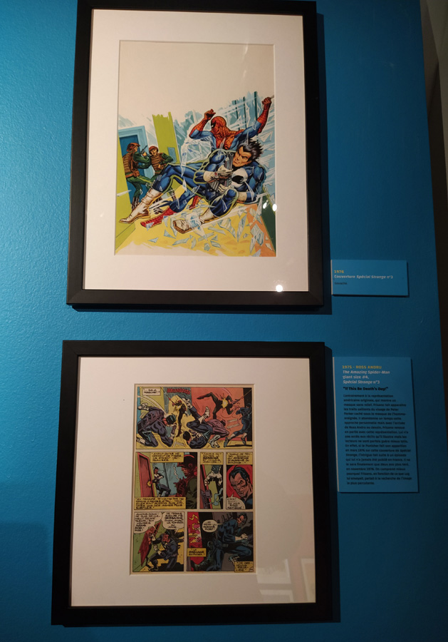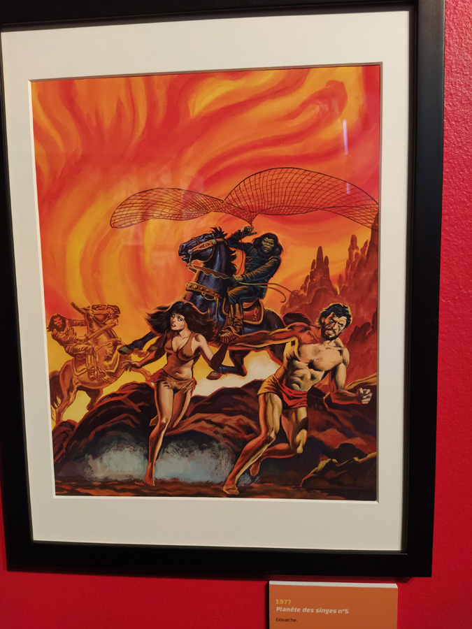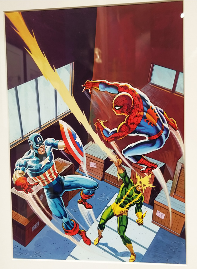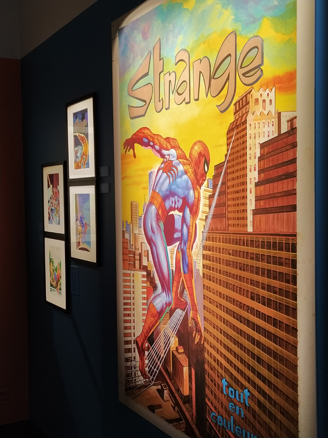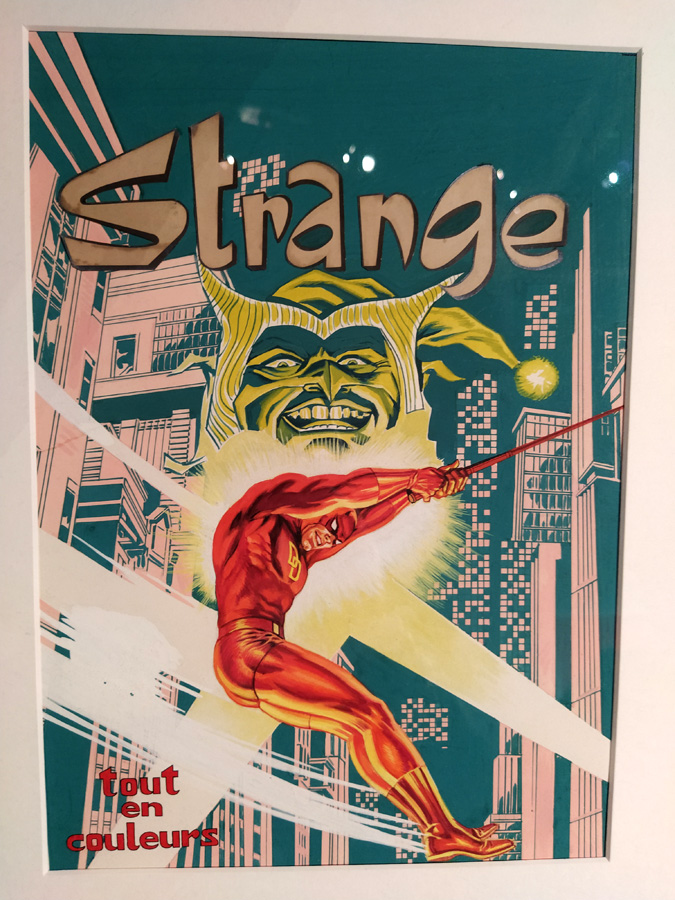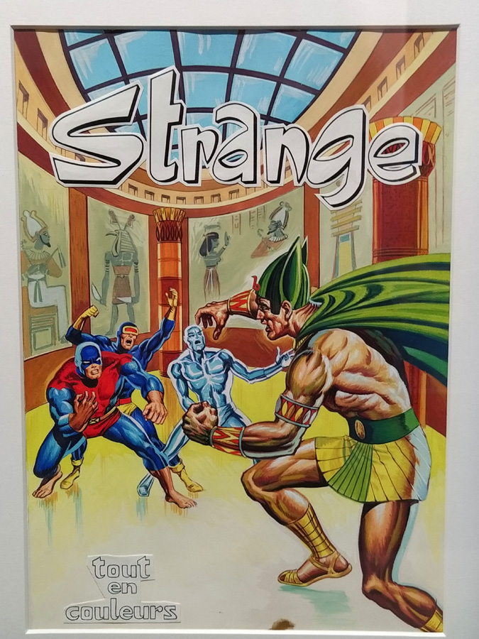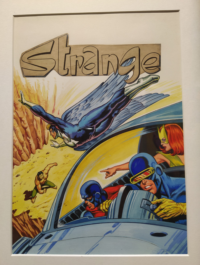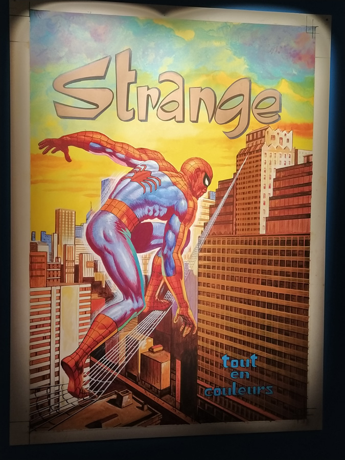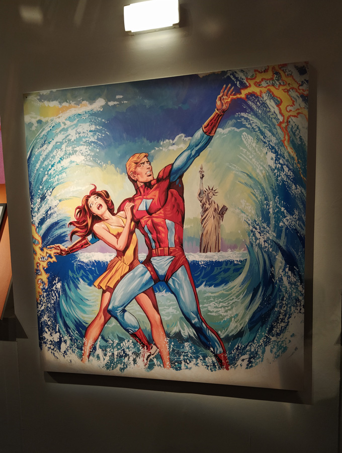 La magie des couvertures de Frisano ne tient pas en une sorte d’invention de l’illustration peinte, mais bien dans une sorte de rencontre collective, confrontant les aspirations artistiques du peintre, les impératifs éditoriaux de Lug et le matériel d’origine, avec des personnages beaucoup plus colorés que ce qu’on lui demandait pour des récits de western ou de guerre. On peut tenter de dire que les revues Marvel se sont vendues seulement à cause de leur couverture. Mais ce n’est pas tout à fait comme si les médias s’étaient précipités pour mettre à la une ses couvertures de Planètes des Singes. Non. Personne ne s’y trompe. Ce que le public préfère, c’est la rencontre des Frisano (Thomas, le fils, est lui aussi mentionné dans l’exposition, faisant doublement mentir nos visiteurs comiques convaincus que les noms ont été effacés) avec Spider-Man et les autres ressortissants de l’univers Marvel. Peut-être d’ailleurs parce que les personnages sont connus et qu’il est ainsi plus facile de voir ce que Frisano prend la peine de souligner, dans des originaux qui n’ont rien perdu de leur éclat. Une rencontre qui a de la patine, qui parfois réserve quelques surprises. A l’occasion le peintre greffe quelques détails d’un personnage sur un autre, comme Angel affublé d’un masque-visière qui semble appartenir au Mimic ou « Strange Girl » affublée d’une épaulette qu’elle n’a jamais possédé dans les comics.