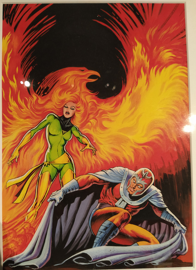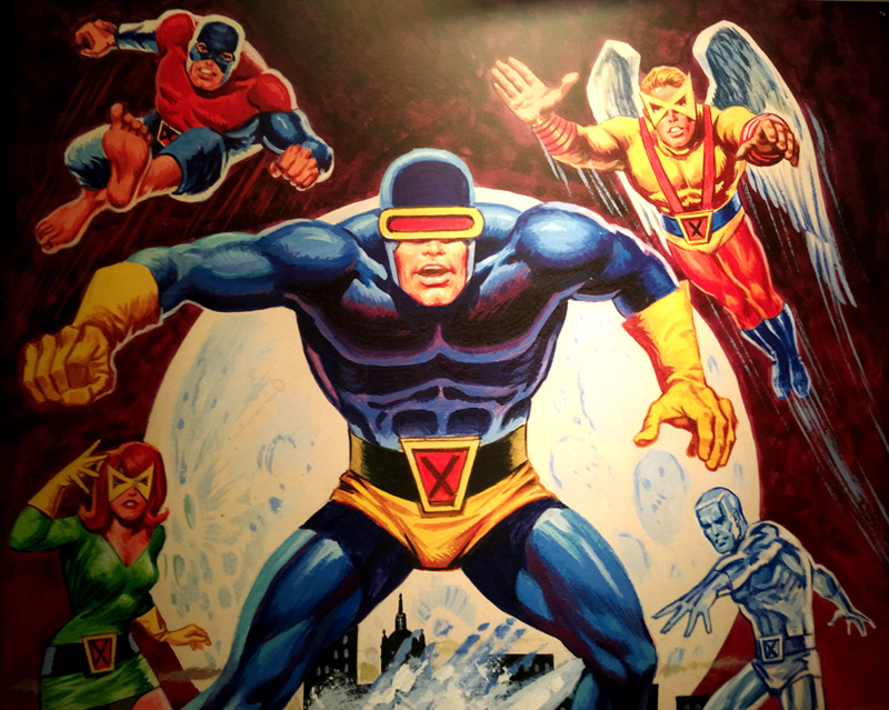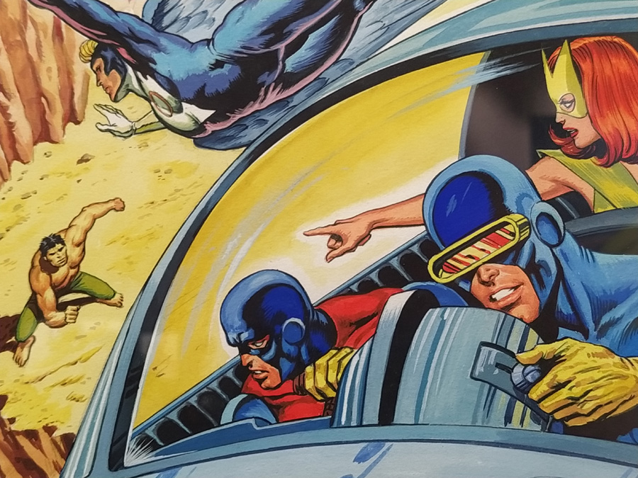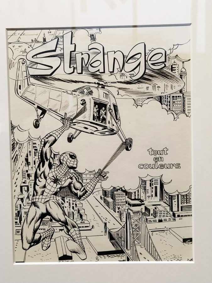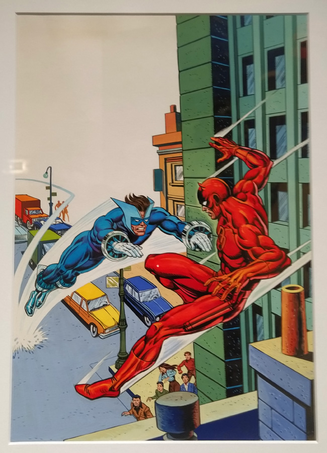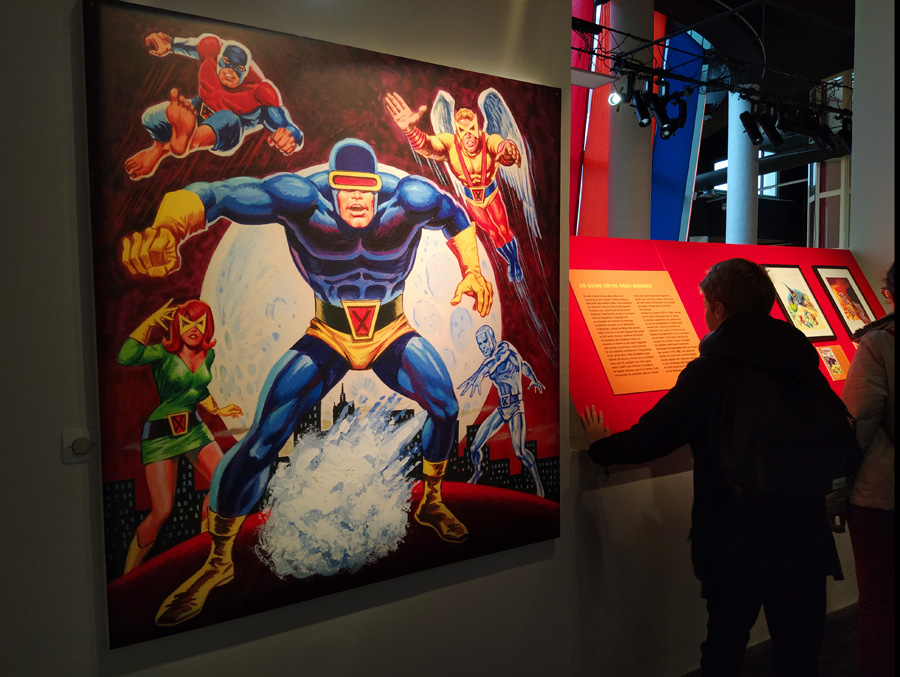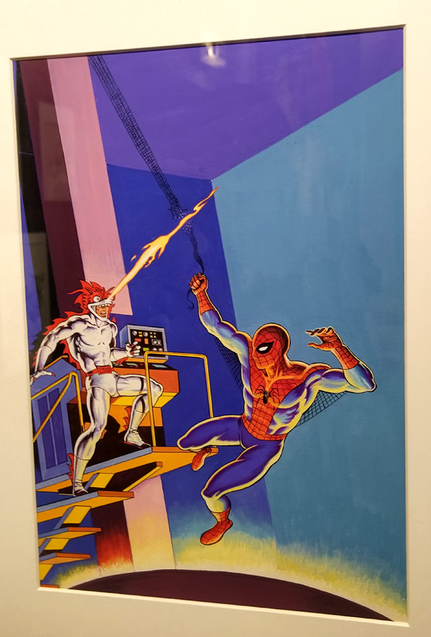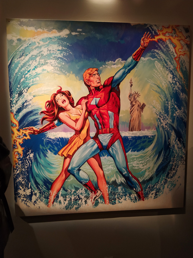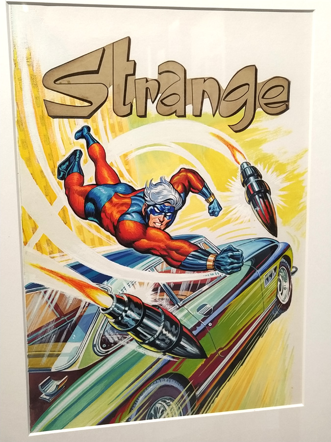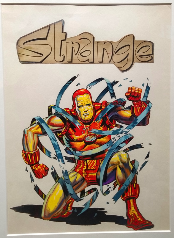 La magie des couvertures de Frisano ne tient pas en une sorte d’invention de l’illustration peinte, mais bien dans une sorte de rencontre collective, confrontant les aspirations artistiques du peintre, les impératifs éditoriaux de Lug et le matériel d’origine, avec des personnages beaucoup plus colorés que ce qu’on lui demandait pour des récits de western ou de guerre. On peut tenter de dire que les revues Marvel se sont vendues seulement à cause de leur couverture. Mais ce n’est pas tout à fait comme si les médias s’étaient précipités pour mettre à la une ses couvertures de Planètes des Singes. Non. Personne ne s’y trompe. Ce que le public préfère, c’est la rencontre des Frisano (Thomas, le fils, est lui aussi mentionné dans l’exposition, faisant doublement mentir nos visiteurs comiques convaincus que les noms ont été effacés) avec Spider-Man et les autres ressortissants de l’univers Marvel. Peut-être d’ailleurs parce que les personnages sont connus et qu’il est ainsi plus facile de voir ce que Frisano prend la peine de souligner, dans des originaux qui n’ont rien perdu de leur éclat. Une rencontre qui a de la patine, qui parfois réserve quelques surprises. A l’occasion le peintre greffe quelques détails d’un personnage sur un autre, comme Angel affublé d’un masque-visière qui semble appartenir au Mimic ou « Strange Girl » affublée d’une épaulette qu’elle n’a jamais possédé dans les comics.