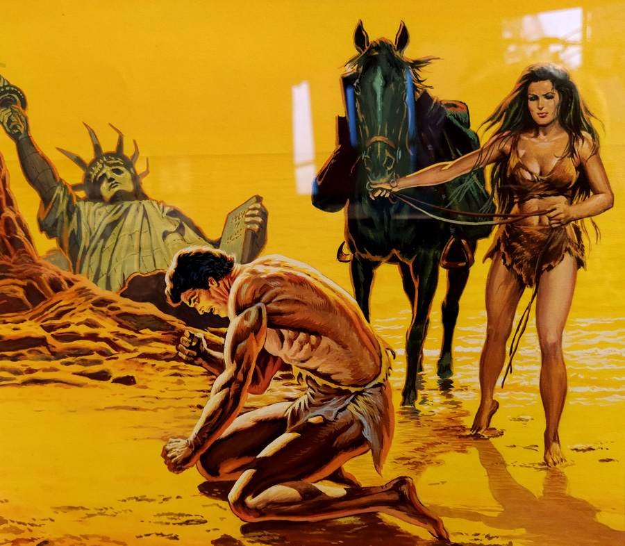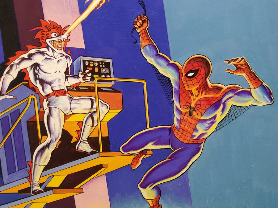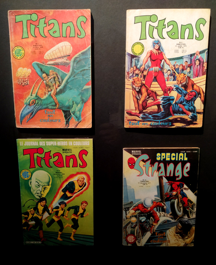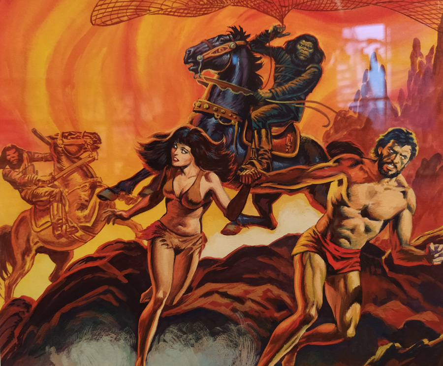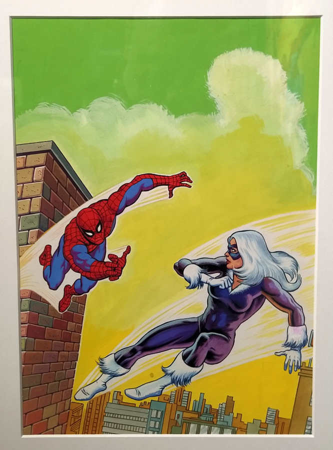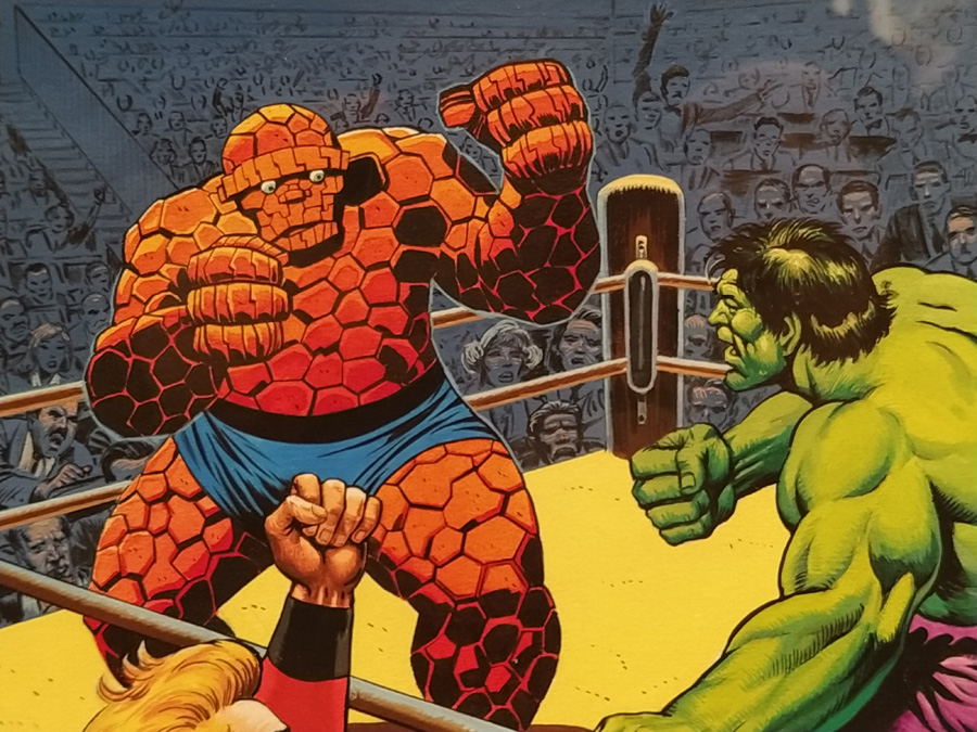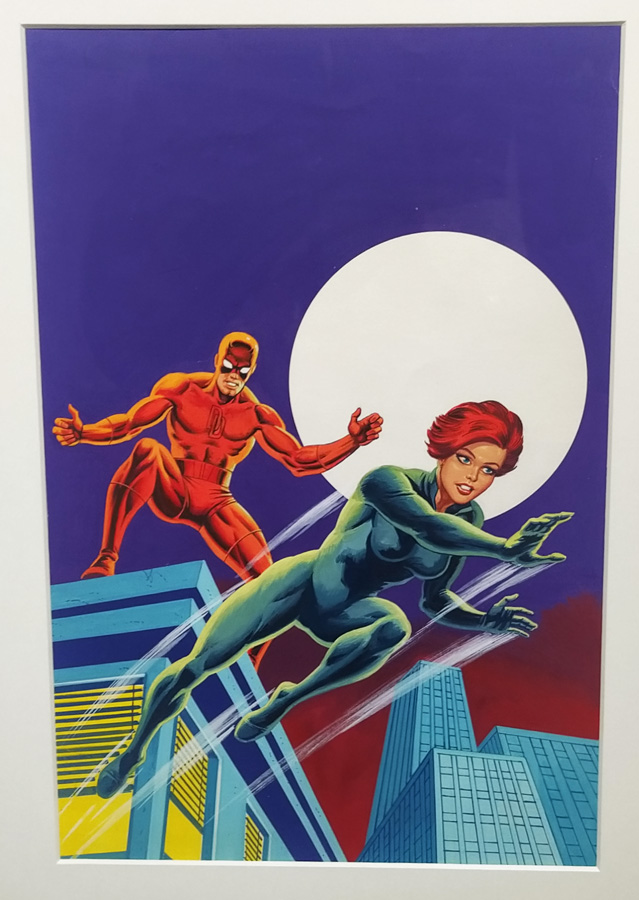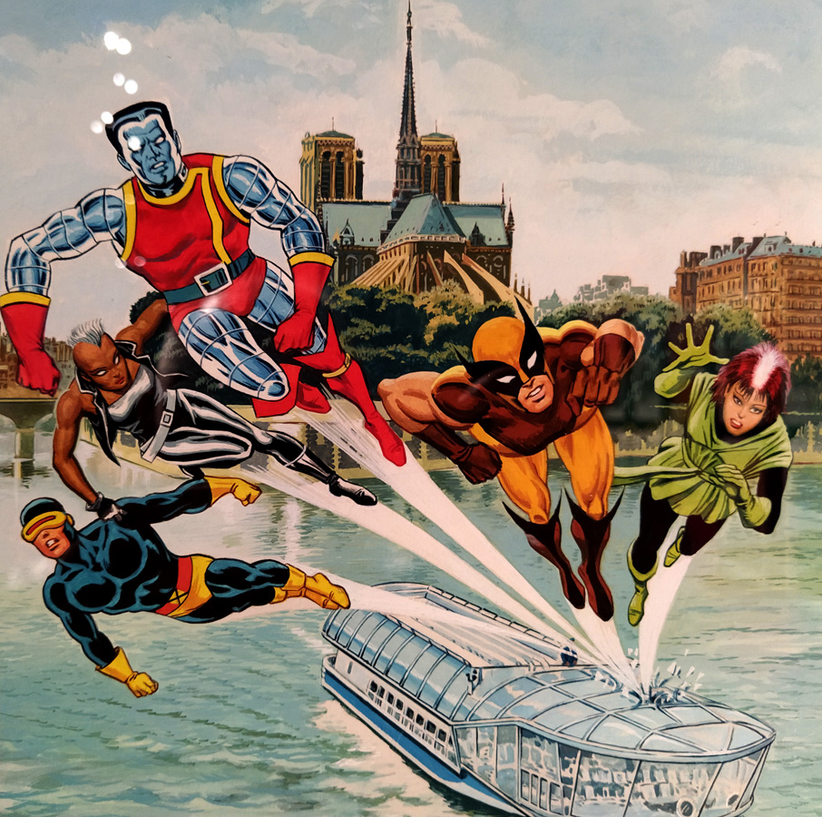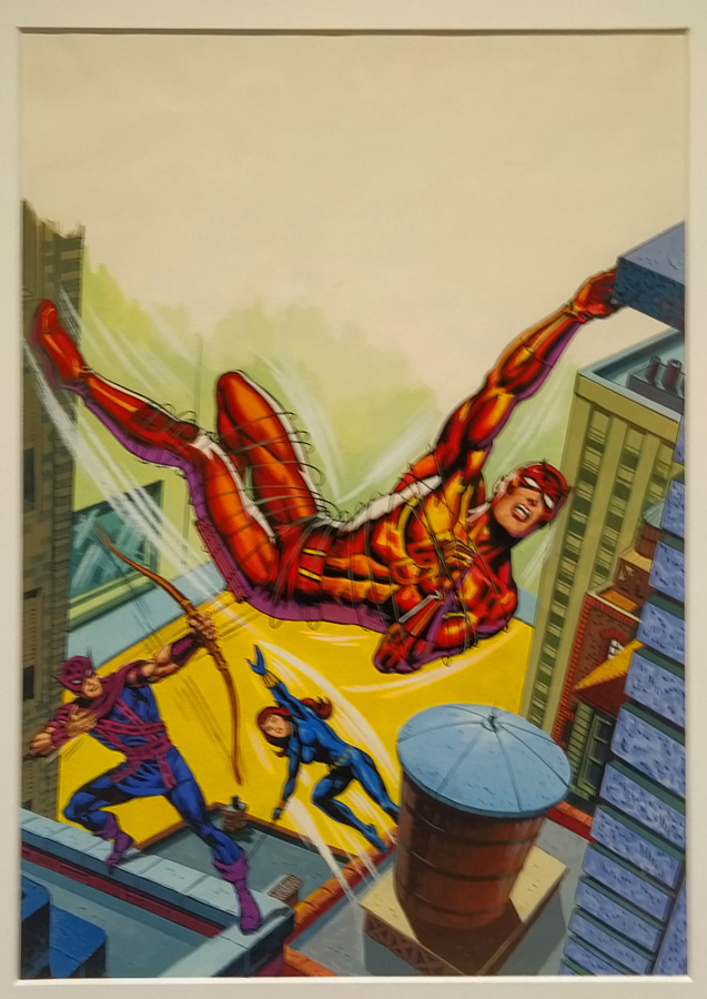 La magie des couvertures de Frisano ne tient pas en une sorte d’invention de l’illustration peinte, mais bien dans une sorte de rencontre collective, confrontant les aspirations artistiques du peintre, les impératifs éditoriaux de Lug et le matériel d’origine, avec des personnages beaucoup plus colorés que ce qu’on lui demandait pour des récits de western ou de guerre. On peut tenter de dire que les revues Marvel se sont vendues seulement à cause de leur couverture. Mais ce n’est pas tout à fait comme si les médias s’étaient précipités pour mettre à la une ses couvertures de Planètes des Singes. Non. Personne ne s’y trompe. Ce que le public préfère, c’est la rencontre des Frisano (Thomas, le fils, est lui aussi mentionné dans l’exposition, faisant doublement mentir nos visiteurs comiques convaincus que les noms ont été effacés) avec Spider-Man et les autres ressortissants de l’univers Marvel. Peut-être d’ailleurs parce que les personnages sont connus et qu’il est ainsi plus facile de voir ce que Frisano prend la peine de souligner, dans des originaux qui n’ont rien perdu de leur éclat. Une rencontre qui a de la patine, qui parfois réserve quelques surprises. A l’occasion le peintre greffe quelques détails d’un personnage sur un autre, comme Angel affublé d’un masque-visière qui semble appartenir au Mimic ou « Strange Girl » affublée d’une épaulette qu’elle n’a jamais possédé dans les comics.