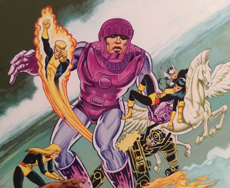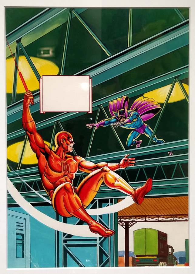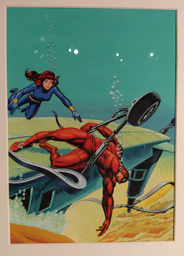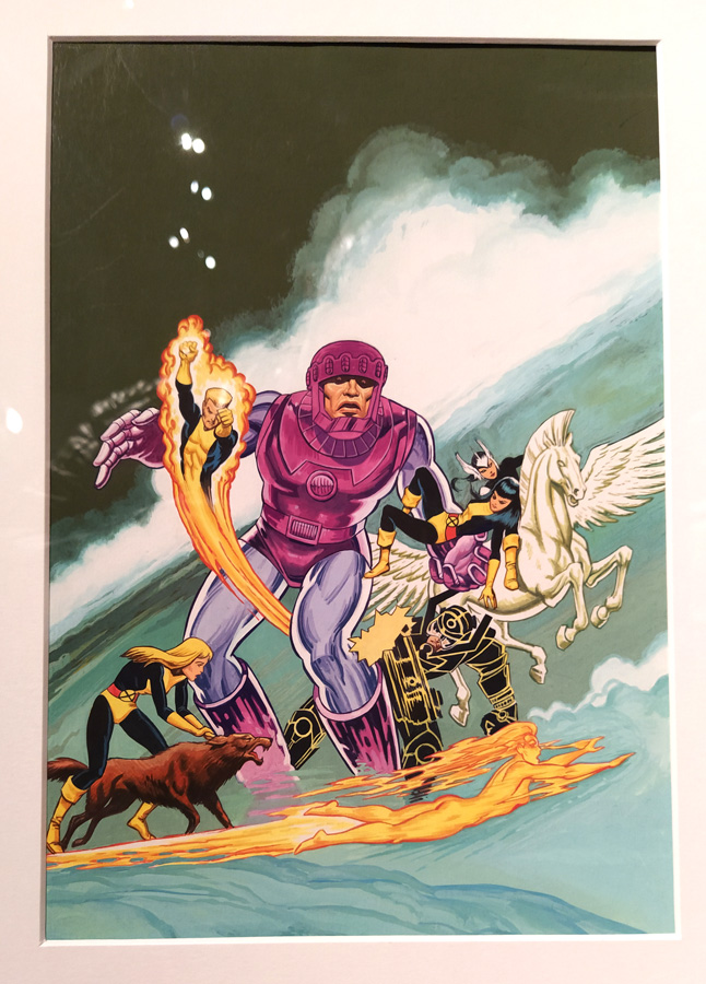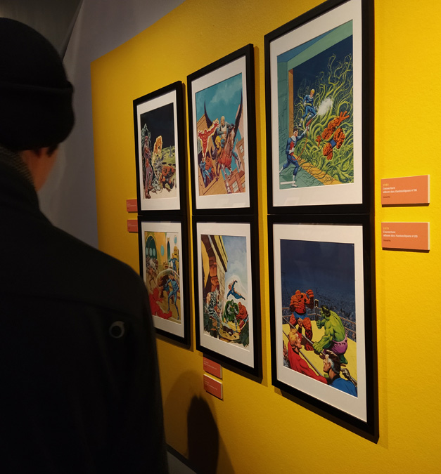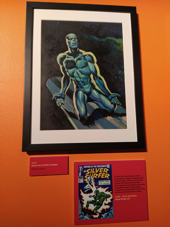 Pour toute une génération de lecteurs français de Marvel, le style Frisano est indissociable d’une certaine époque des comics. A l’époque, c’est souvent ce qui permettait de savoir immédiatement, instinctivement, si une revue était éditée par Lug, par opposition aux autres détenteurs de licences Marvel dans l’hexagone. Pas sûr du tout qu’en posant ses peintures si lumineuses Jean Frisano lui-même se soit posé la question de la postérité de ses œuvres, une fois que les numéros avaient disparus des kiosques. On a du mal à croire qu’il aurait pu imaginer être le sujet d’une exposition personnelle dans le cadre du Festival International de la Bande-Dessinée d’Angoulême. Déjà qu’à l’époque que l’intelligentzia de la Bande Dessinée méprisait allégrement la « BD de gare », la considération d’un artiste qui ne faisait « que » les couvertures ne risquait guère de l’emmener bien loin. La considération de Frisano ? elle est venue des lecteurs, pour qui ses peintures sont devenues comme une énorme madeleine de Proust. Frisano n’était pas « que » le peintre des couverture, il était l’auteur d’une véritable signalétique, d’un état d’esprit.