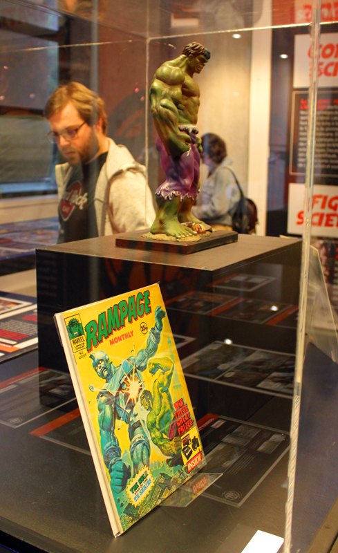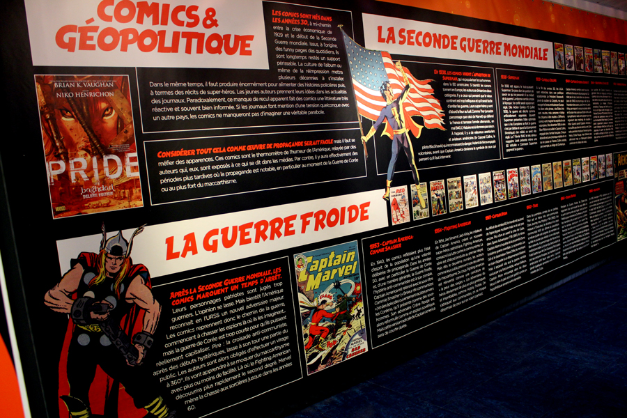 Etant partie prenante dans l’écriture de l’exposition (au côté de noms tels que J.P. Gabilliet, J. Depelley, Pascal Robert ou encore Michel Montheillet) je ne m’étendrais pas sur la qualité/non-qualité de l’exposition (ces quelques photos parleront d’elles-mêmes). Notez aussi qu’un petit catalogue d’exposition (120 pages reprenant l’essentiel des textes et de l’iconographie) est édité pour l’occasion. Diffusé gratuitement, son tirage est limité à quelques centaines d’exemplaires et il devrait donc être rapidement épuisé. Pour ce qui est du vernissage, les responsables du lieu expliquaient que c’était la première fois qu’ils profitaient d’un public si nombreux pour une inauguration d’exposition. Il faut dire que « La Société des Comics » se déroule en parallèle du festival Lyon Game Show / Comic’ Gone qui se tient ce week-end, à la Halle Tony Garnier. L’occasion pour certains des auteurs de comics déjà présents pour le week-end de se joindre à la fête. L’expo, elle se poursuit donc jusqu’au 29 novembre 2018, avec plusieurs animations annexes (la première se déroulait d’ailleurs cet après-midi, avec une master class de John Higgins).