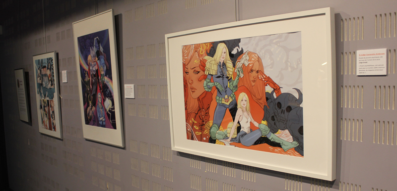 Française mais québecoise d’adoption, Marguerite Sauvage a joué le jeu en sélectionnant principalement des illustrations qui mettent à l’honneur des héroïnes de la BD américaine et même anglaise. Ainsi on retrouve fort logiquement Wonder Woman, Thor dans sa version féminine mais aussi la télépathe Juge Anderson (échappée des pages de Juge Dredd), Moon Girl, Jean Grey ou encore Vanessa Ives (Eva Green dans Penny Dreadful). Si Faith (l’héroïne de Valiant) n’apparaît pas dans les images accrochées aux murs, alors qu’elle et Marguerite sont pourtant bien associées dans l’esprit des lecteurs, c’est que le personnage a droit à un traitement spécial, juste à côté, une animation sur écran permet de montrer aux visiteurs de la médiathèque comment l’artiste conçoit une page de Faith, partant des crayonnés pour aller jusqu’à la version finale. A noter qu’à l’occasion de l’expo, la médiathèque a édité un petit badge collector, reprenant le personnage inédit que Marguerite a créé pour l’affiche de l’évènement.
