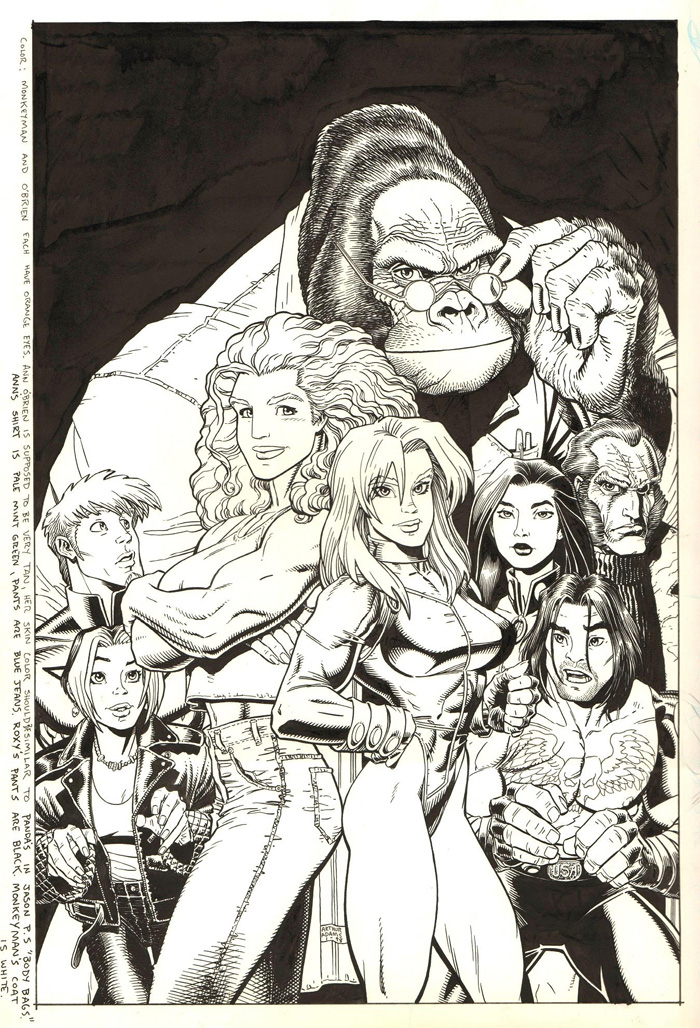 Dans ce dessin pour une couverture d’album de la création d’Art Adams, Monkeyman and O’brien, le dessinateur reprend les motifs principaux de King Kong. On a bien là un singe géant et une belle héroïne. Sauf que… en ajoutant au gorille une petite paire de lunettes rondes cerclées de fer (symbole de l’intellectuel typique), il fait du désir primitif une tension contrôlée par l’intelligence. Monkeyman reste une représentation de la virilité ultime et qui déborde de testostérone, mais il pense, il réfléchit… c’est la raison qui le guide. Quant à la belle O’Brien, sa partenaire, si sa longue chevelure rousse et ondulée, la finesse de son visage et l’opulence de sa poitrine lui conservent une féminité classique et désirable, les muscles affleurent sous le collant, le poing est fermé, le regard déterminé et, à l’égale de Monkeyman, elle manie une arme lourde et sophistiquée. C’est fait : Arthur Adams a changé le Mythe ! Le désir mâle et animal s’est fait intelligent ; la féminité passive et victimisée s’est faite forte et active.