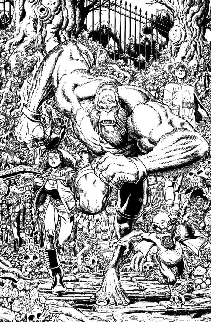 On voit ici qu’Arthur Adams, quand il est en « récréation » (il s’agit d’une image pour un « print »), revient au mythe de King Kong tel qu’il apparaît en 1933. Willis O’Brien, responsable des effets spéciaux du film, était de toute évidence imprégné par la lumière et la luxuriance des visuels de Gustave Doré lorsqu’il conçoit les décors de Skull Island. Le même Gustave Doré qui a inspiré Mœbius. Le même Mœbius qui irrigue le style d’Art Adams et dont on retrouve, en particulier dans cette image, le soin accordé aux détails et les hachures pointillistes. Toute la scène est dans le cadre. Les motifs classiques du mythe sont là : le singe hypertrophié, incarnation d’un désir mâle primitif, défend l’objet de son désir (la belle jeune femme sexy, appeurée et impuissante), contre le danger primal du dinosaure.