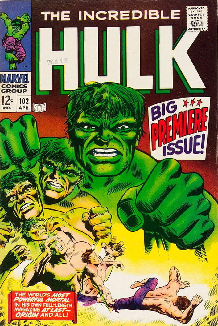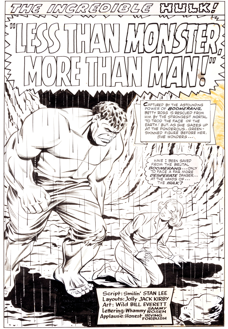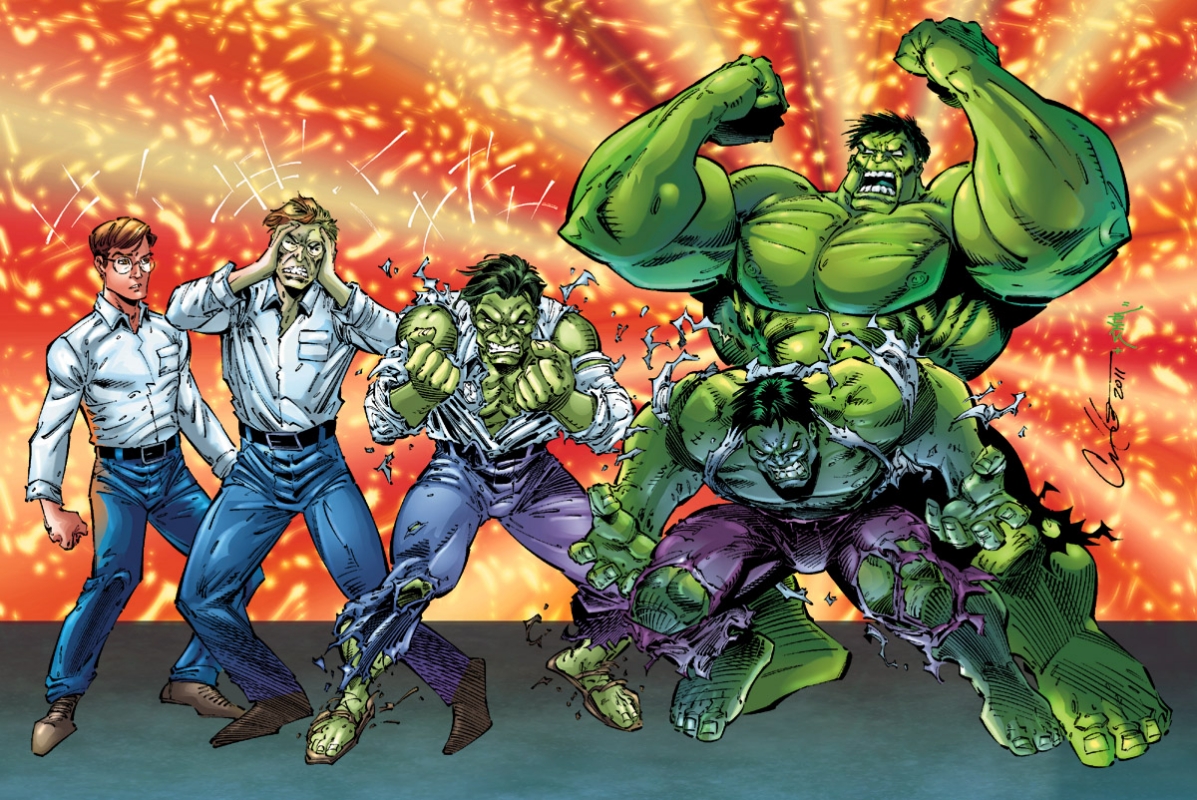 Le monochrome pourpre du costume de Daredevil devra attendre un peu pour s’afficher ; le super-héroïsme tragico-lyrique de Silver Surfer, personnage tout d’abord secondaire, s’installera petit à petit ; la logorrhée à l’humour potache de Spider-Man, durant ses combats, ne se déversera pas avant quelques épisodes ; l’anachronisme suranné de Captain America, lui, devra être précédé par la congélation du héros avant de le caractériser ; quant aux griffes notoirement rétractiles de Wolverine, elles ne sont, lors de l’apparition du personnage, qu’un accessoire de son costume. HULK n’échappe pas à cette règle. Le monstre vert (gris dans un premier temps), est foncièrement méchant et, surtout, c’est à la tombée de la nuit que Banner se transforme. On connaît déjà ces caractéristiques qui font du nouveau protagoniste Marvel une sorte de croisement entre Jekyll et Hyde, la créature de Frankenstein et le Loup Garou. Mais bientôt, la spécificité de HULK émerge : c’est la colère qui sera le déclencheur de la transformation de Banner. Et c’est le retour au calme qui induira la métamorphose inverse.