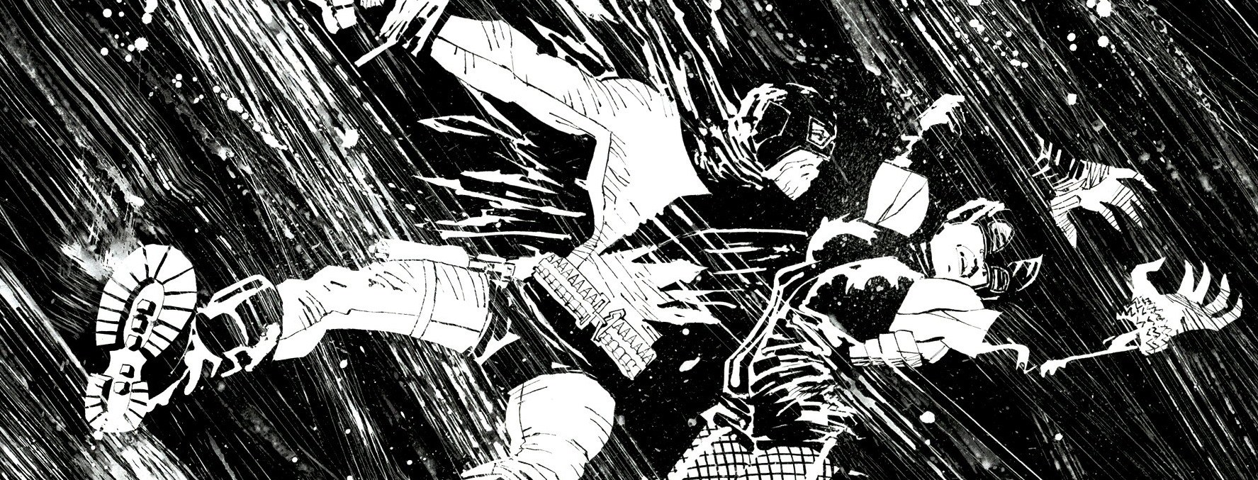 On sait que Frank Miller, débarquant sur Daredevil, va révolutionner la narration séquentielle du genre ; il va aussi y injecter du polar, de la culture nippone, ou encore de la dystopie avec son Batman. Mais allons voir directement ses travaux les plus récents. Ce qui frappe immédiatement à la vue des planches de Holy Terror ou de celles qu’il va réaliser et encrer pour The Dark Knight III : The Master Race (ainsi que les couvertures variantes), c’est la débauche de taches, de projections, de coulures d’encre, techniques qui renvoient au « dripping » et au « pouring » de Jackson Pollock (le peintre n’a pas conçu cette méthode mais il l’a massivement utilisée au point qu’elle est couramment associée à son œuvre). Miller bombarde sa feuille de dessin, il la gratte, il y colle violemment des empreintes, il la balaye de gros pinceaux aux traces fulgurantes ; taches, petits points, traits dans tous les sens, giclées de noir ou de blanc, cet encrage « dirty » porte en lui l’énergie bouillonnante de la gestuelle du dessinateur. Energie encore, énergie toujours ! Mais parle-t-on de la même ?
