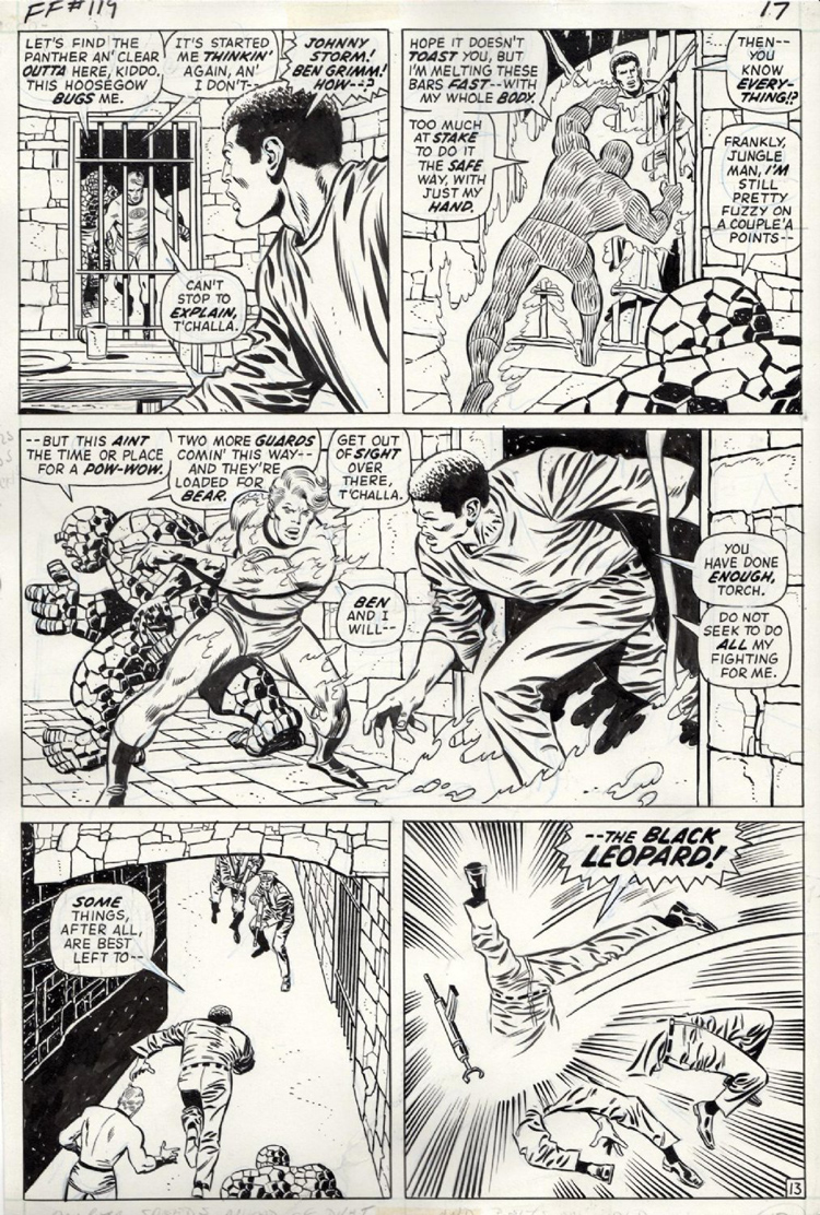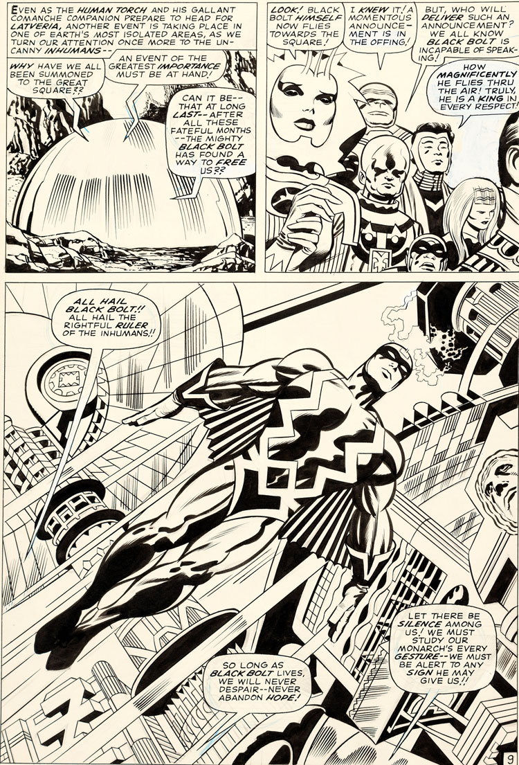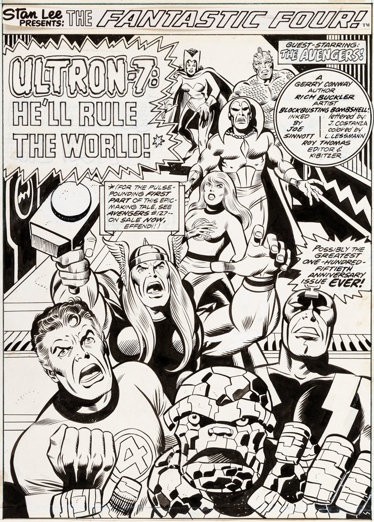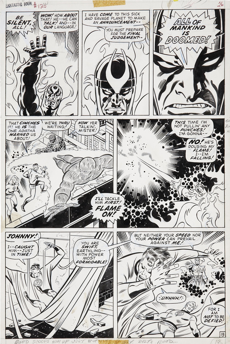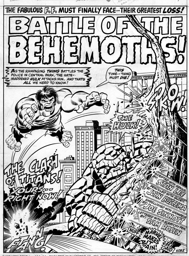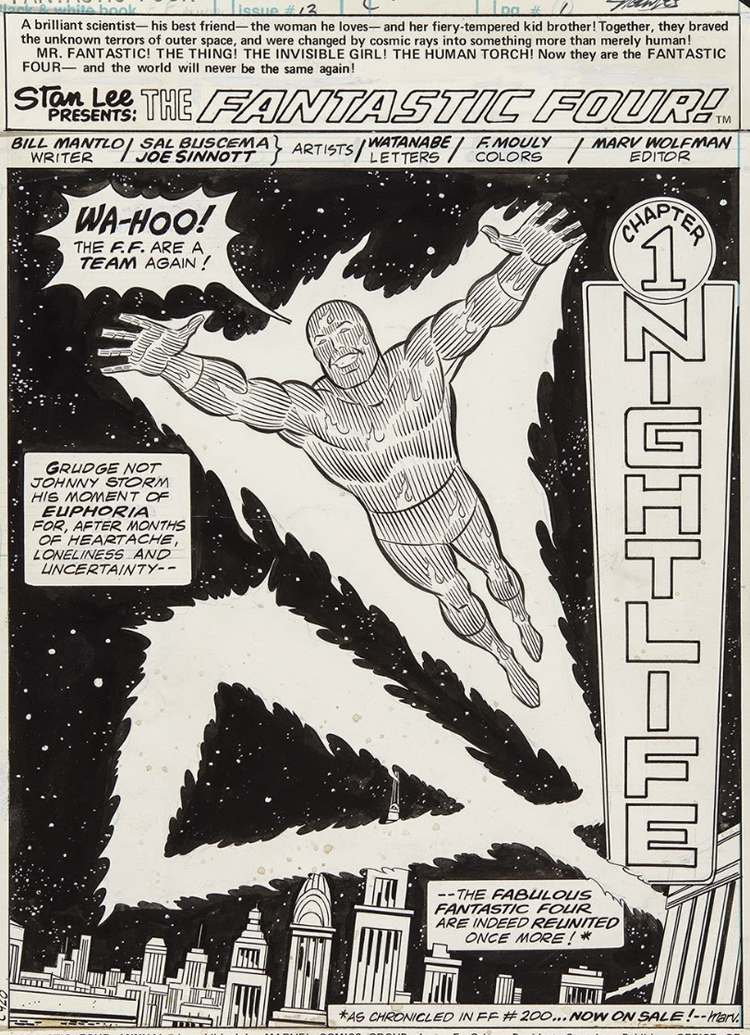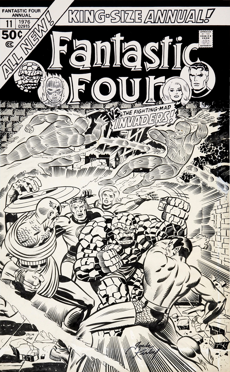 Joe est aussi encreur. Et au début des années soixante, Lee lui demande d’encrer une série dont il n’a jamais entendu parler. Le nez sur ses propres pages, il ne s’intéresse pas vraiment aux autres séries éditées par Marvel. Mais Stan Lee lui propose de filer un coup de main à Jack Kirby sur les Fantastic Four. Qu’est-ce que c’est que ça que les Quatre Fantastiques ? Sinnott ne le sait pas. On lui met dans les mains Fantastic Four #4 en lui disant de se mettre au niveau. L’encreur adore la série, la trouve différente. Ça tombe bien, on lui demande d’encre Fantastic Four #5, la première apparition du Doctor Doom (ou Docteur Fatalis si vous préférez). Joe ne deviendra l’encreur régulier de la série que quelques années plus tard mais le destin ne lui réserve pas le plus mauvais moment pour entrer en scène. En travaillant sur les FF à partir du #44, Joe Sinnott devient le troisième mousquetaire de la série au moment où elle va produire les Inhumans mais aussi le Silver Surfer, Galactus, Black Panther. L’arrivée de Sinnott coïncide avec une certaine maturité du run de Kirby. Ironie du sort : les deux hommes travaillent surtout de chez eux et ne se rencontreront que bien après leur collaboration historique, en 1972, dans les allées d’une convention de comics.