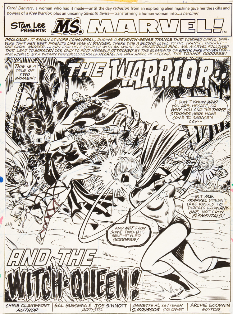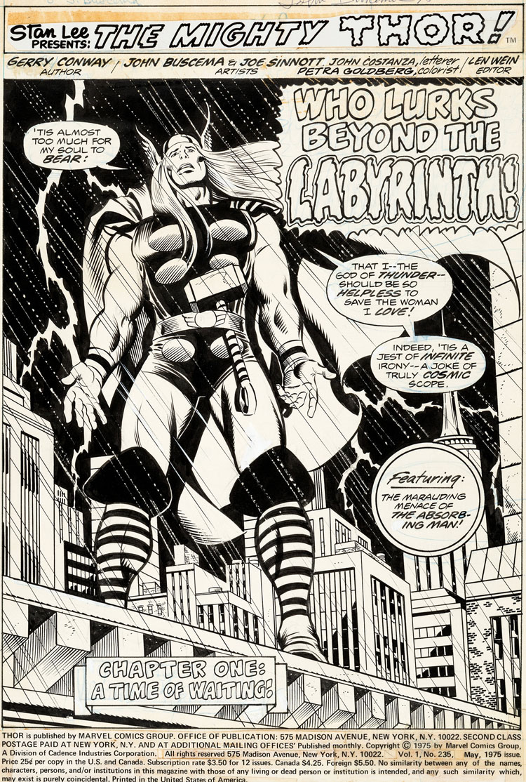 Entretemps, en 1962, Joe Sinnott a encré la première apparition du dieu Thor et reprend même pendant quelques mois le dessin de la série. Joe va aussi encrer les exploits de Nick Fury, Agent of S.H.I.E.L.D. Désormais pleinement entré dans le genre super-héroïque il devient aussi l’encreur de Gene Colan sur Captain America. Quand Jack Kirby claque la porte de Marvel, Sinnott devient garant de la continuité visuelle, reste l’encreur sur ses séries en cours. Mais Martin Goodman vend Marvel, Kirby et Ditko sont partis tandis que Stan Lee (passant de plus en plus de temps à promouvoir Marvel et de moins en moins de temps à gérer les affaires courantes) se fait rare. Ce n’est plus la « société des copains » et il est évident que dans les années 70 Joe redirige une grosse partie de ses activités sur Archie Comics (avec des séries comme Sabrina The Teen-Age Witch). On continue cependant de le retrouver dans des publications Marvel. Il est par exemple le partenaire de John Buscema lors du lancement de Ms. Marvel (future Captain Marvel) en 1977. Quand le scénariste Gerry Conway et Buscema s’en vont, Sinnott reste le seul membre de l’équipe créative originelle, continuant là aussi d’apporter une continuité visuelle.