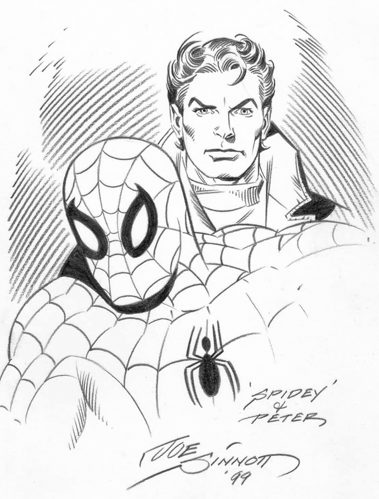 Evoquer quelques exemples du travail de Joe Sinnott c’est forcément s’exposer au jeu des lacunes. Oui, il en manque. Plein. L’apport et la présente du dessinateur/encreur ne peuvent se résumer en un bref article Officiellement « retiré des comics » en 1992, Joe Sinnott avait cependant gardé une activité dans le métier : il a été pendant de nombreuses années l’encreur du strip de Spider-Man (d’abord écrit par Stan Lee puis repris ensuite par Roy Thomas). C’était une manière de reformer, au moins en partie le « Marvel Gang » des sixties. Joe a encré le strip jusqu’à la fin, en mars 2019. Il avait alors 92 ans et n’aura donc guère connu la retraite…