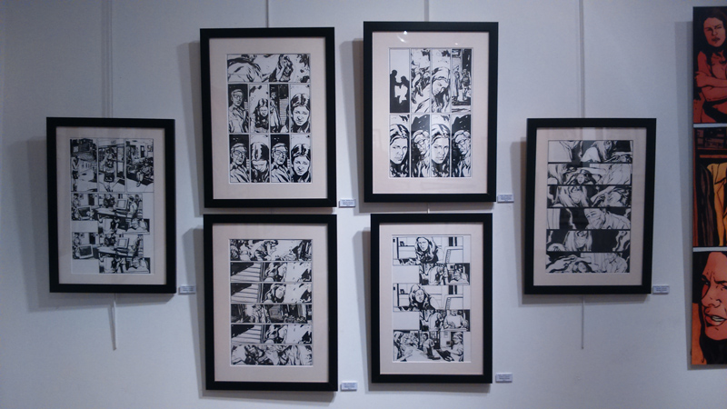On trouve aussi quelques croquis préparatoires comme les esquisses du costume de Jewel. Bref, Gaydos est réellement dans la place, son univers graphique imprègne les murs de la galerie (petite, elle ne comporte que deux pièces, soyez prévenus) tandis qu’on ne peut que féliciter – cela vaut le coup d’insister – Arludik et Netflix de faire le choix de mettre en avant la BD d’origine plutôt que de penser coûte que coûte à caser sa série TV. Bien sûr, parler de l’un permet d’évoquer l’autre. On tend vers une symbiose. Mais par la même occasion, on peut ainsi faire découvrir aux curieux, l’œuvre d’origine, jouer l’immersion en attendant le 20 novembre (date de la diffusion de toute la première saison de la série TV). On se prend à rêver que l’initiative soit répétée pour les autres personnages à venir chez Netflix (Luke Cage, Iron Fist…).