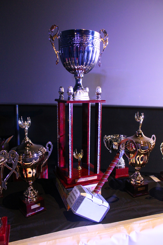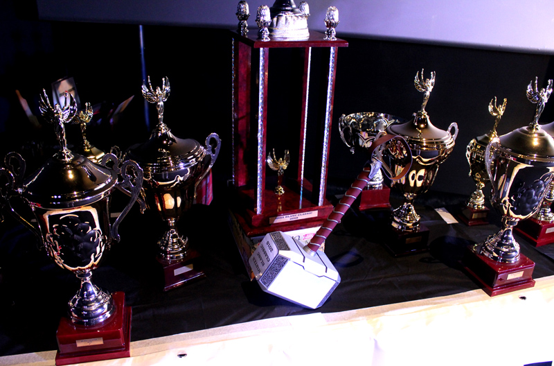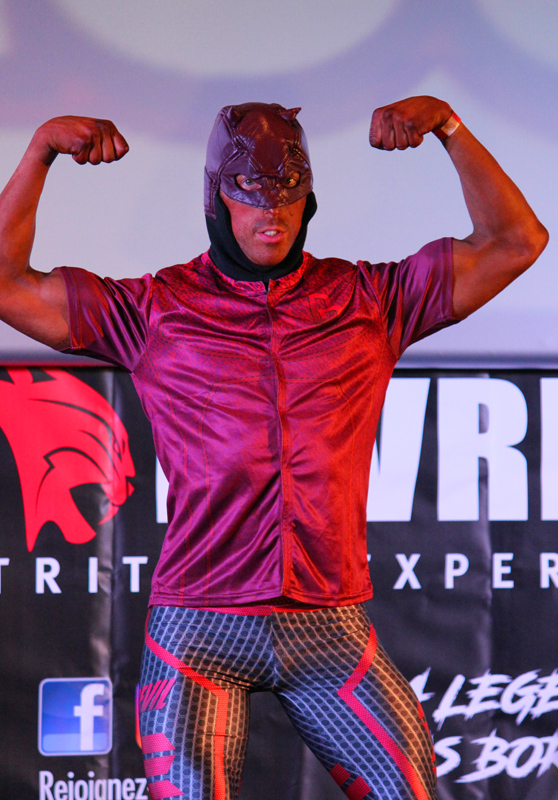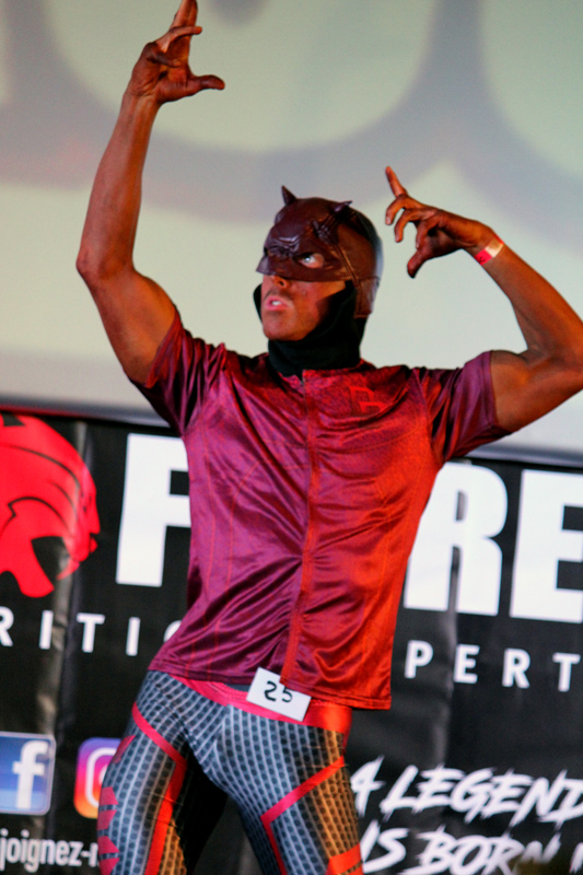 Non loin de là les récompenses attendent. Pour la plupart ce sont des coupes mais au milieu trône le marteau de Thor, destiné au champion toutes catégories. Et puis il a les tatouages des participants… l’un porte à l’épaule le crâne enflammé du Ghost Rider. Une jeune femme a, sur la poitrine, le dessin du générateur d’Iron Man. Quand France Ceilles (l’une des gagnantes toutes catégories féminines de 2017) vient chercher sa récompense, elle est aux couleurs de Wonder Woman. Quelques démonstrations libres permettent aussi à d’autres athlètes de porter des déguisements sommaires (c’est qu’il s’agit de montrer ses muscles, et donc de ne pas les cacher comme pour un cosplay) de Batman ou Daredevil. Une concurrente, à défaut d’adopter un costume, se livre à une démonstration/danse que l’on ne renierait sans doute pas sur Paradise Island. Plus tard, pour le coup, c’est un Iron Man dans une véritable armure qui nous rejoint. Le fait que les culturistes sont nombreux à s’intéresser à cette culture est avéré. Reste alors, avec la conférence, à parler du contraire. Est-ce que les comics, eux, se reconnaissent dans ce sport. Pas toujours…