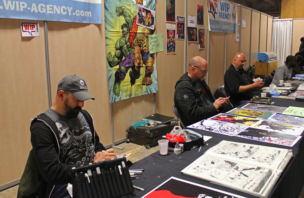 De fait, il y avait un vrai corner Game of Thrones ce week-end. Ce n’est pas la première fois que la manifestation accueille des comédiens de la série, mais ce week-end Charles Dance (le patriarche Lannister), Ellie Kendrick (Meera Reed), Keisha Castle-Hughes (Obara Sand) se prêtaient à l’exercice des photo-shootings mais aussi de quelques panels sur le déroulement de la série. L’occasion pour Ellie de glisser quelques phrases de français pour expliquer qu’elle avait été triste du sort d’Hodor. Parmi les différents acteurs présents, Christian Slater était également une sensation. Pour ce qui est d’un réel « comics corner », on pouvait trouver de nombreux artistes internationaux, qu’il s’agisse de John Bolton (hélas parti assez vite le dimanche), Claudio Castellini, Mark Texeira, Pascual Ferry, Steve Scott, Agustin Padilla ou Yildiray Cinar lequel réalisait de superbes « art commissions » (on a vu passer un Conan de toute beauté). Dans cette Artist Alley, on trouvait aussi quelques régionaux de l’étape comme Michel Borderie ou Guile Sharp, qui en profiter pour présenter son nouvel ouvrage, un livre de dessins de super-héros « à colorier » mais qu’on peut également garder sous le coude dans l’état, en noir et blanc, et qui reste superbe.