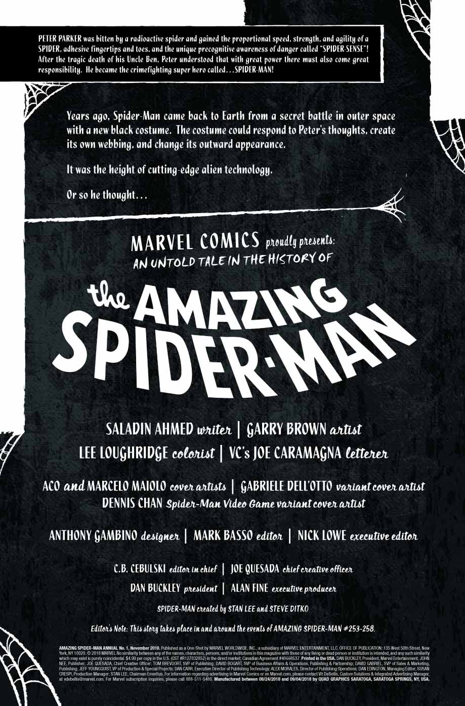 17 septembre 2018« Ties That Bind. » Years ago, Spider-Man came back from an alien world with a fantastic new costume – one he eventually learned was a living alien symbiote looking to bond with him permanently! But before he rejected the costume that went on to become Venom, many a night the symbiote would creep onto Peter, and unbeknownst to its host, take them out into the night! Now, for the first time, see just what the symbiote steered Peter into during these mysterious nighttime excursions! Saladin Ahmed weaves a new nightmare fairy tale.