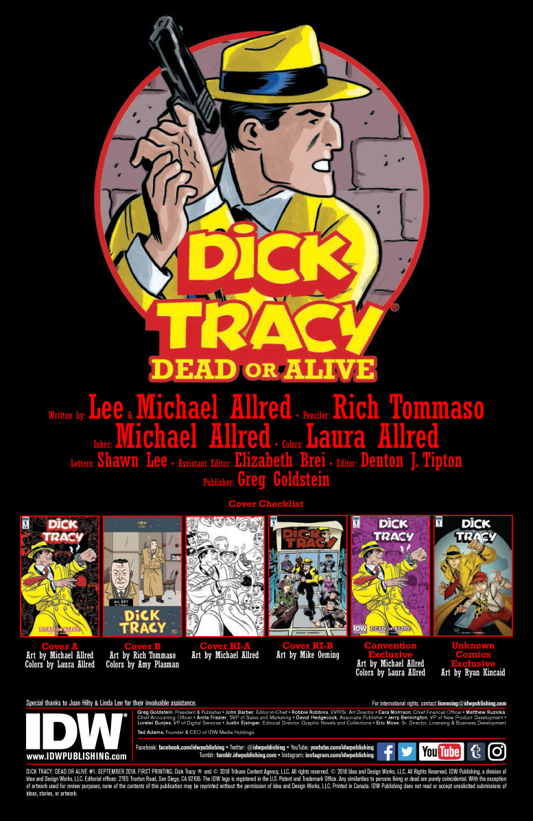 19 septembre 2018IDW Publishing proudly presents the rebirth of one the most iconic comic-strip heroes of all time, Dick Tracy! The All-American detective just made the biggest collar of his career, and it only cost him his job! But now the honest cop has packed his bags for « the city by the lake, » and its criminals better watch out! Reimagined for the 21st century through a retro lens by the superstar team of Michael Allred, Lee Allred, Rich Tommaso and Laura Allred, Dick Tracy: Dead or Alive is a lock to be the pop-art event of 2018! Bizarre villains! Crooked cops! Gunfights galore!