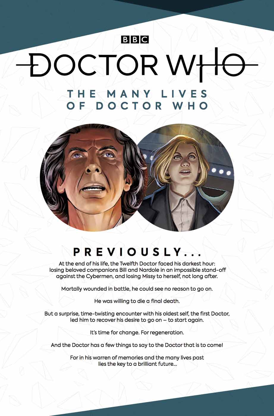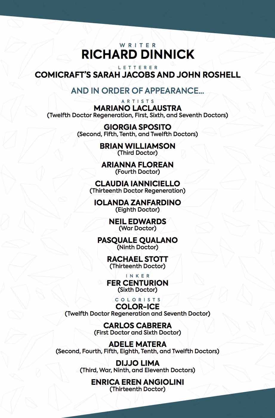 Marian Laclaustra drawing adventures for the Twelfth, First, and Seventh Doctors! Giorgia Sposito drawing the Second, Fifth, Tenth, and Twelfth Doctors! Arianna Florean drawing the Third and Sixth Doctors! Brian Williamson drawing the Fourth Doctor! Iolanda Zanfardino drawing the Eighth Doctor! Neil Edwards drawing the War Doctor! Pasquale Qualano drawing the Ninth and Eleventh Doctors! Rachael Slott and Claudia Ianniciello drawing our first look at the Thirteenth Doctor!
