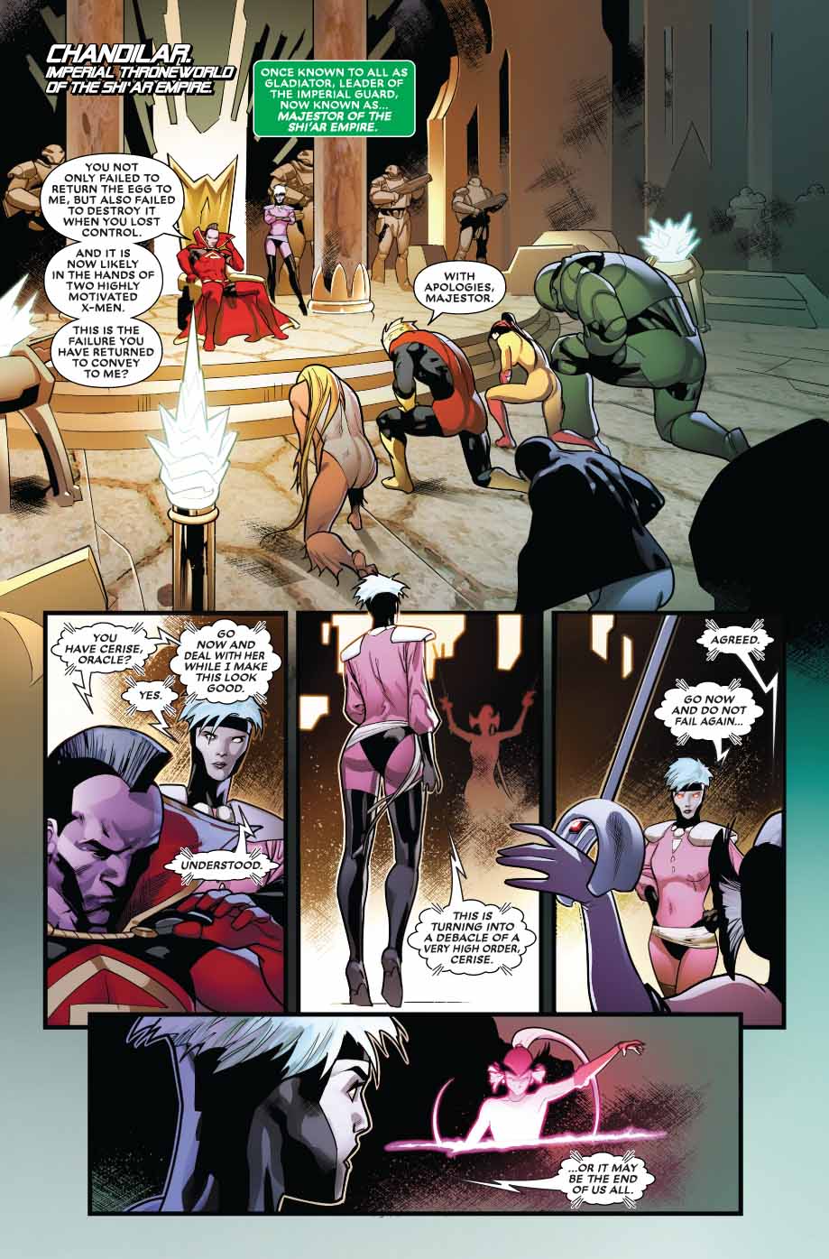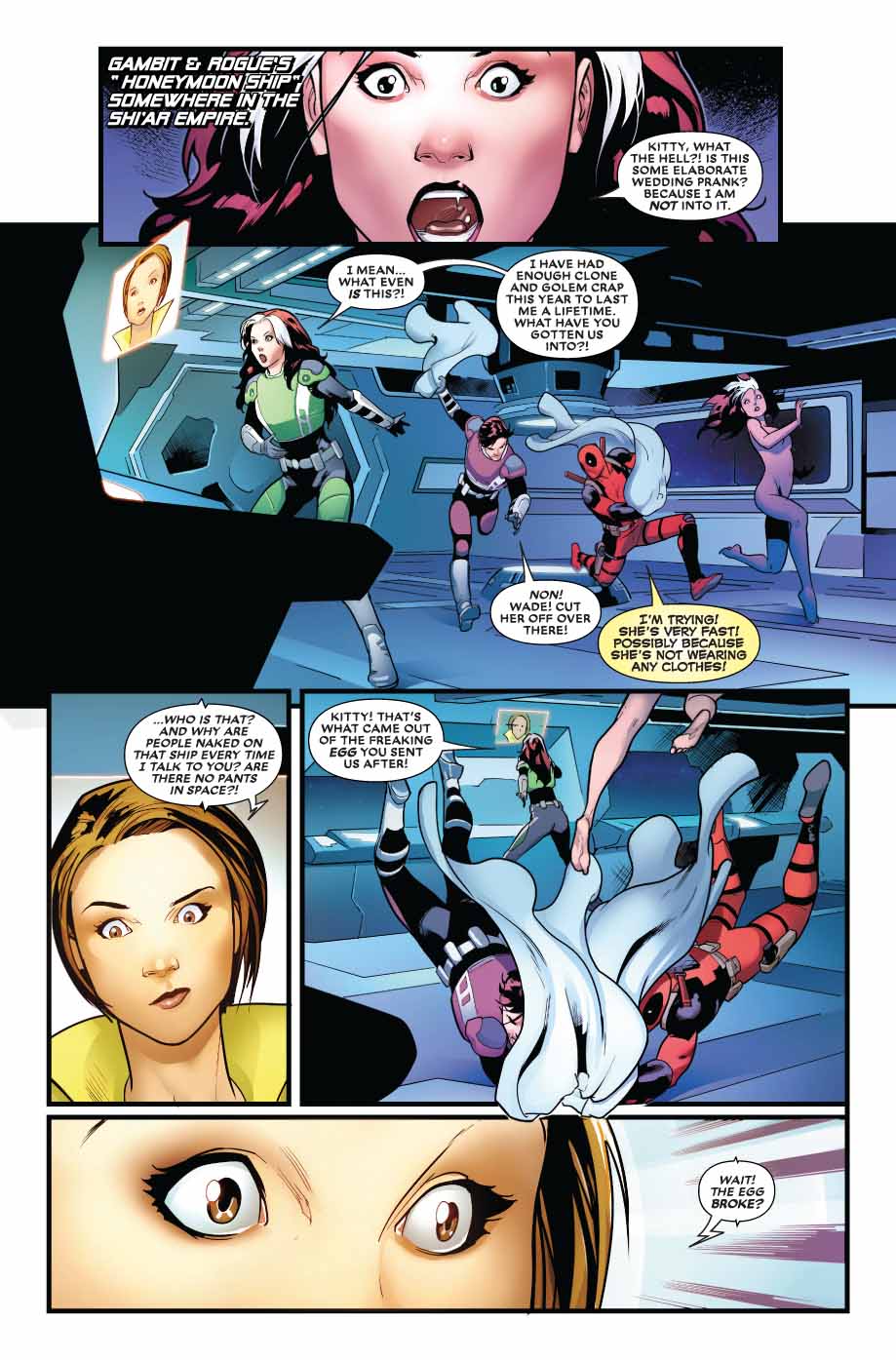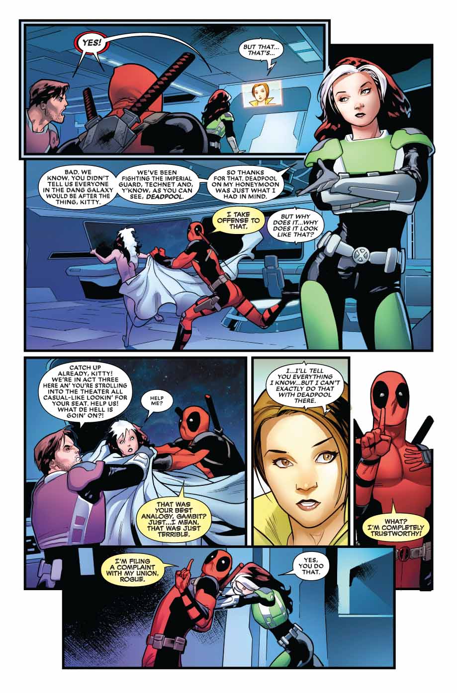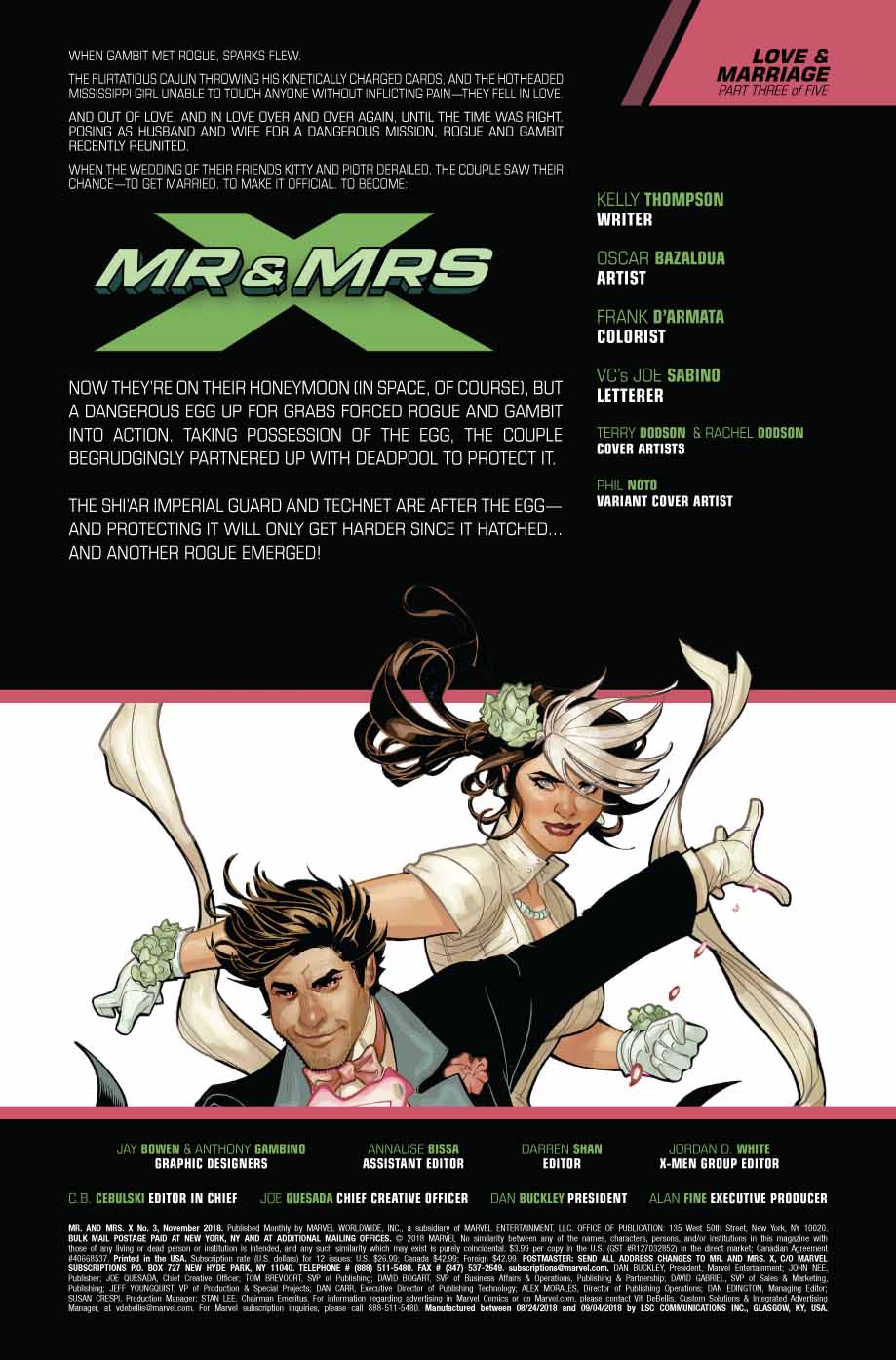 16 septembre 2018« Love & Marriage, » part three. Rogue and Gambit’s romantic getaway is but a faint memory as they’re forced to team up with Deadpool to protect a dangerous and extremely valuable « package » when half the galaxy comes to claim it. What secrets does the package hold that the Imperial Guard and Deathbird (with an entire Shi’ar rebellion in tow!) will risk everything for? More importantly, can Rogue, Gambit, and Deadpool stop bickering long enough to win?