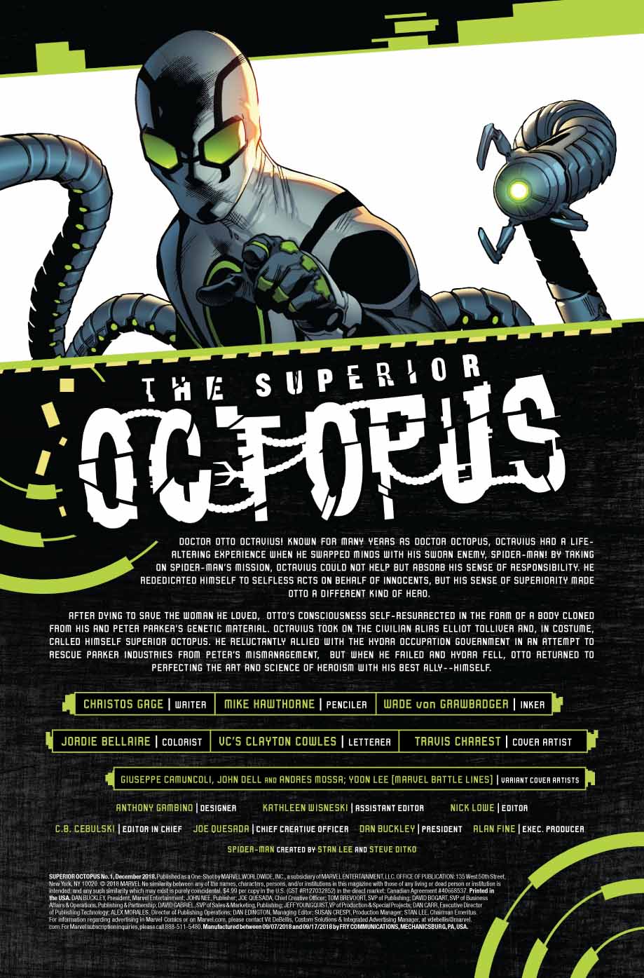 29 septembre 2018Spider-Geddon tie-in. Doc Ock has set up shop as San Francisco’s protector, but you won’t believe his methods. Some of Otto Octavius’ new super-hero strategies may make Spider-Man regret letting him free, but the good doctor swears that he’s the Superior Octopus!