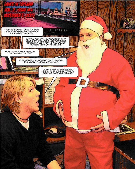 For example, in the current holiday issue, Santa Claus hires The Dufus Detective (Lance Dilfro) to stop a man who is selling Chinese toys coated with lead paint. Earlier in the second season, Lance prevented a US arms manufacturer who lost out on a bid to the US Government from selling his wares to one of our enemies. In his own way, Lance draws attention to serious issues and manages to resolve problems with much help from his sister and friends.