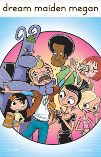 [ENGLISH] Jef is, let’s face it, your classic teenage nobody: gawky, awkward, taken advantage of. He’s complete clueless about girls, though they’re pretty much all he thinks about — and dreams about. And it’s a dream that finally lands Jef what he thinks he wants, a gorgeous girl by his side, in this case Dream Maiden Megan, the title character of the new SLG Publishing graphic novel. Dream Maiden Megan is the newest work from Ian and Tyson Smith, creators of the hit all-ages graphic novel Emily and the Intergalactic Lemonade Stand. Megan delivers dreams, but when Jef wakes up and catches her in the act, she becomes mystically « tethered » to him until he falls asleep and dreams the dream she was giving him. Caffeine- and monster-addled (Megan employs the monster Been Geen to keep the amorous Jef in line), Jef can’t keep up with a vain, spoiled, party-girl dream maiden. And Megan isn’t about to let him get comfortable! She’s determined to get rid of him — even if it means getting him a date.