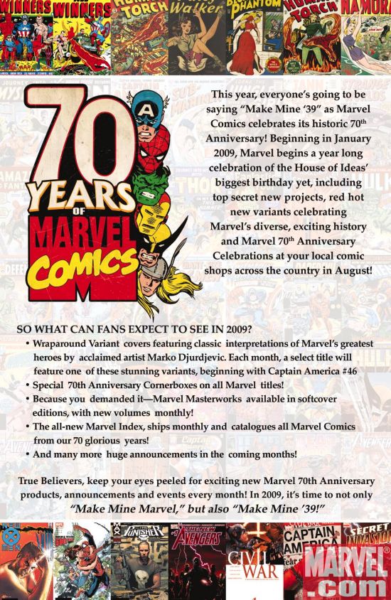 [ENGLISH] Marvel tells us: Beginning in January 2009, Marvel will begin a year-long celebration of its historic 70th Anniversary! From special collections to commemorative covers beginning with Marko Djurdjevic’s stunning variant to Captain America #46, fans everywhere will be saying “Make Mine Marvel”…and “Make Mine ‘39”!