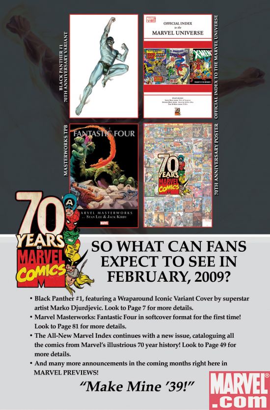 [ENGLISH] Marvel tells us: Marvel Continues Historic 70th Anniversary Celebration In February 2009! Continuing in February 2009, Marvel’s year-long celebration of its historic 70th Anniversary takes it to the next level! From an iconic Marko Djurdjevic’s variant to Black Panther #1, to new softcover editions of Marvel Masterworks and more, fans everywhere will be saying “Make Mine Marvel”…and “Make Mine ‘39”! Stay tuned to www.marvel.com and Marvel Previews every month for more exciting details on Marvel’s 70th Anniversary!