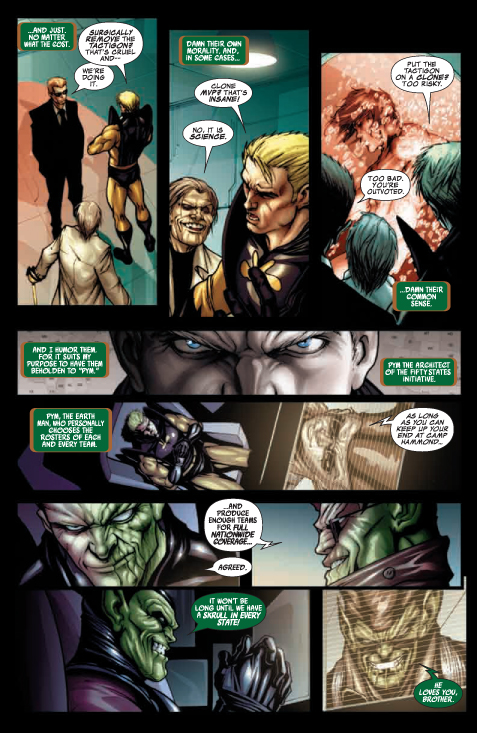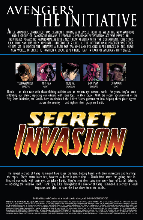 [ENGLISH] Marvel tells us: THE STORY: SECRET INVASION TIE-IN « We Have Met the Enemy and He Is Us! » During the INFILTRATION, a Skrull at the heart of the Camp Hammond said these words: « It won’t be long until we have a Skrull in every state! « Now that Skrull stands revealed and the fate of The Initiative, the United States, and Planet Earth hang in the balance. Plus: Former Avenger, Delroy Garret, assumes the mantle and arsenal of Earth’s greatest Skrull-Hunter, THE 3-D MAN. He’s here to chew bubblegum and kick some Skrull-@$$. And he’s all out of bubblegum.