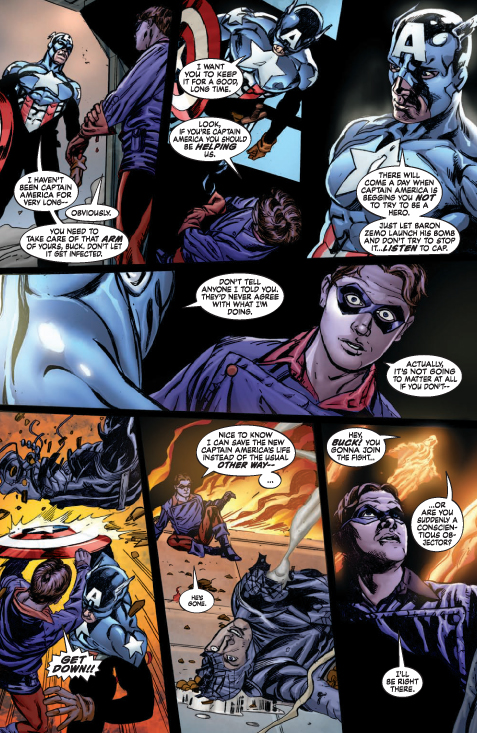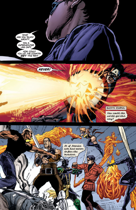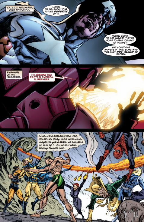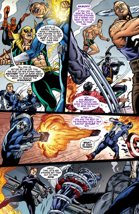 [ENGLISH] Marvel tells us: The Story: The second act of the maxi-series begins as our three teams — the Avengers vs. the Avengers vs the Invaders face off in an all-out battle aboard the S.H.I.E.L.D. Helicarrier! While battle rages, Dr. Strange attempts to solve the mystery of what ripped the greatest Heroes Of World War II to the present day, and how to put them back. Will the combined might of three super-teams be enough to stop the cross-time devastation? Match all of this with the return of one of the Avengers deadliest villains — one with a particular interest in the Original Human Torch — and you know, from what you’ve seen so far, the return of Captain America is only the tip of the iceberg!