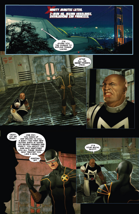With Cyclops eagerly waiting to interrogate his former comrade, it would appear that the game is over for the time-traveling cop. So why is Bishop smiling? What trick does he have up his sleeve? And what does this mean for Cable and the baby?