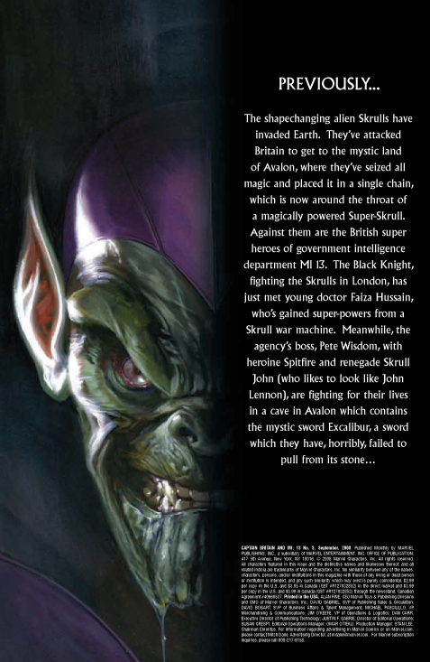 [ENGLISH] Marvel tells us: The story – SECRET INVASION TIE-IN, PART 3 (of 4) It’s Science Fiction versus Fantasy as the war machines of the unstoppable Skrull army invade the magical realm of Avalon. Can Pete Wisdom and the rest of MI 13 keep the Skrulls from taking control of the world’s magic? Will this be our heroes’ finest hour? Or has the sun finally set on the British Isles? And what is Spitfire doing to that Skrull on the cover?
