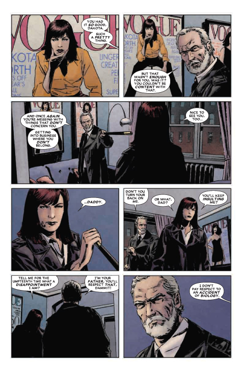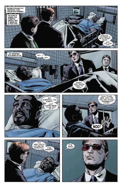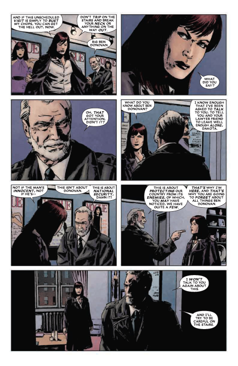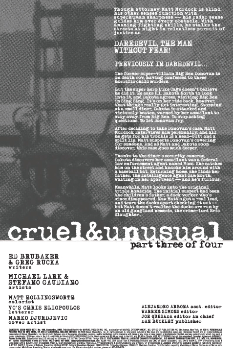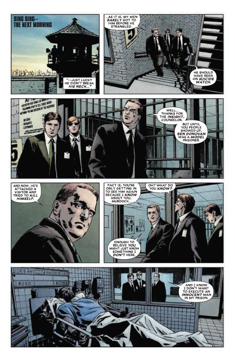 [ENGLISH] Marvel tells us: THE STORY: Part 3 of « Cruel and Unusual » with special guest co-writer Greg Rucka joining the acclaimed DD creative team! Daredevil and Dakota North have investigated all angles of the brutal murders that Big Ben Donovan sits on Death Row for, and all they’ve come up with is more questions and conspiracies. Why does Big Ben want to be executed for a crime he probably didn’t commit? And why does the government want Dakota and Matt Murdock off the case? Find out these answers and more!