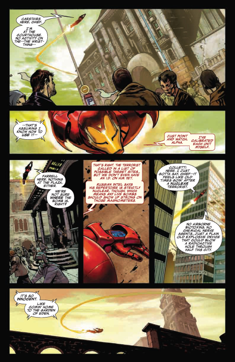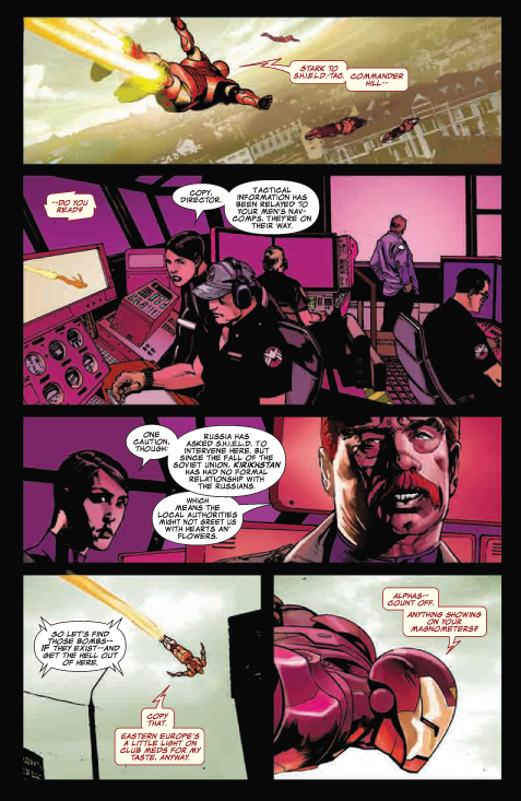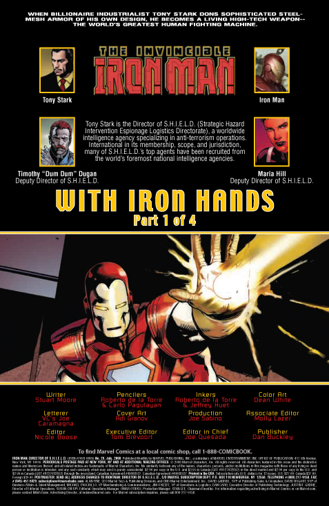 [ENGLISH] Marvel tells us: Iron Man: Director of SHIELD #29 – The story: Beginning “WITH IRON HANDS,” a four-part epic! When an unseen terrorist throws a struggling nation into chaos, Tony Stark’s past as a munitions manufacturer collides with his present role as Director of S.H.I.E.L.D. Is Tony himself responsible? And what’s his connection to the deadly menace growing within S.H.I.E.L.D. itself?