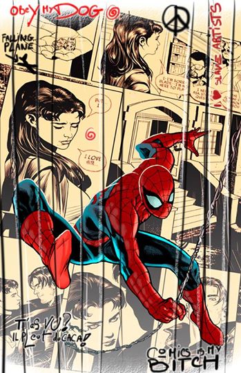 Alors voilà. N’utilisons pas les mots un peu corsés que certains ont cru bon d’employer. Trop facile ensuite pour l’intéressé de s’ériger en victime. Cela ne servirait à rien, non plus d’intervenir physiquement lors de certains vernissages (encore que, s’ils sont ouverts au public, personne n’est en droit de vous interdire de vous y pointer, de manière passive et cordiale, à quatre ou cinq avec le même t-shirt d’Amazing Spider-Man #100 et un post-it « je porte l’original »). Restons polis, courtois. Ne précisons que les faits (comme le faisaient bon nombre des autres censurés de la page de l’intéressé) : Monsieur Spark se contente régulièrement de mélanger un personnage existant avec un autre fond existant d’une autre provenance sans que la valeur ajoutée du montage nous apparaisse comme pertinente ou personnelle. Ce qui pourrait s’arrêter à une question de goût ou une maladresse est aggravé par cette volonté qu’il a de faire disparaître les interventions de personnes comme Dan Panosian, Guile ou d’autres et même la moindre mention de leur nom. Andy Warhol a vécu avant les réseaux sociaux, mais il n’a jamais tenté de convaincre ses admirateurs que la soupe Campbell n’existait pas. Il n’a jamais, non plus, trouvé refuge derrière une fausse loi européenne en maquillant un texte piqué auprès un organisme qui n’a pas de fonction de législateur. Tout cela ce sont des faits. C’est un fait aussi que toute cette affaire aurait pu aisément être réglée si, au lieu de chercher à faire taire ou en opposant des fausses références à la parodie, l’individu en question s’était contenté d’un bref « ah mais y a maldonne. Pas de problème, je vais rajouter un petit carton pour expliquer que la source vient d’un de vos dessins » (parce que la plupart des artistes ne demandaient que ça, une citation). Et alors, poussons le What If… L’hallu totale… l’optimisme débridé dans le genre humain. Si Benjamin Spark, dans un grand moment d’humilité, avait poussé la chose jusqu’à répondre à un Dan Panosian « Non mais vous savez, c’était ma façon d’exprimer que j’admire et j’estime votre travail, d’ailleurs pourquoi ne pas envisager une grande expo ensemble dans les galeries qui, à travers moi, se sont intéressées à votre style ? ». Tout ça aurait pu se résoudre en l’espace d’un week-end. Mais il aurait fallu un peu de bonne foi. Et quand l’attachée de presse (celle qui cite des textes de loi fantaisistes) commence à lancer des commentaires sur FB pour expliquer que tous ces gens sont des jaloux et des frustrés, ça ne fait rien, non plus pour arranger les choses. Pour seule preuve d’estime Dan Panosian et ses pairs se sont fait éjecter de la page concernée et traités de « jaloux ». La belle affaire.