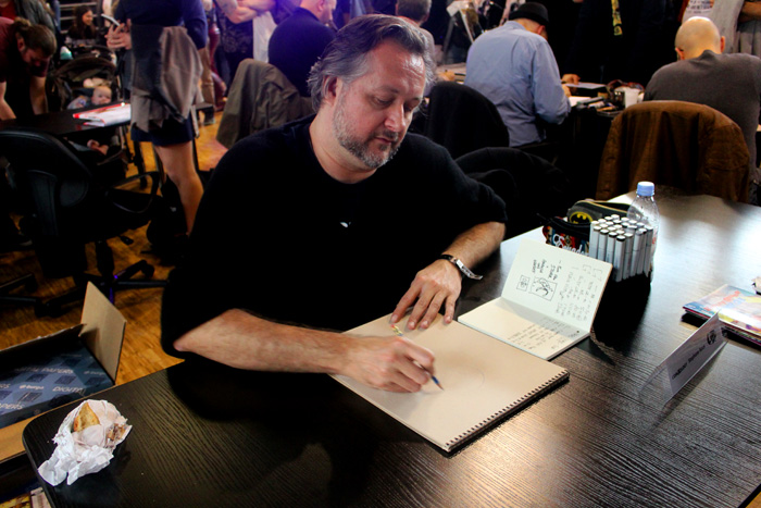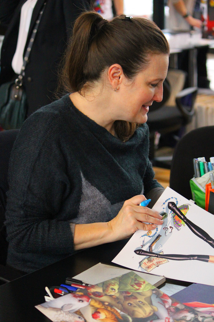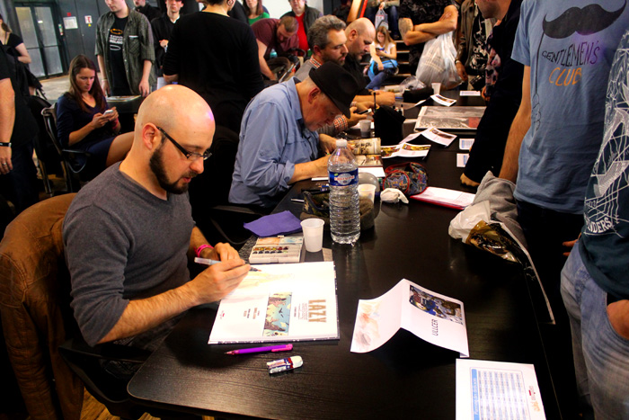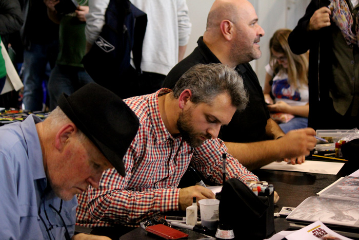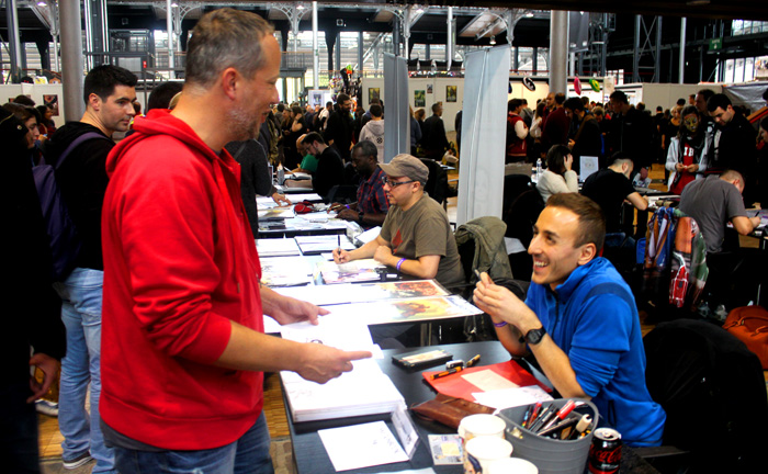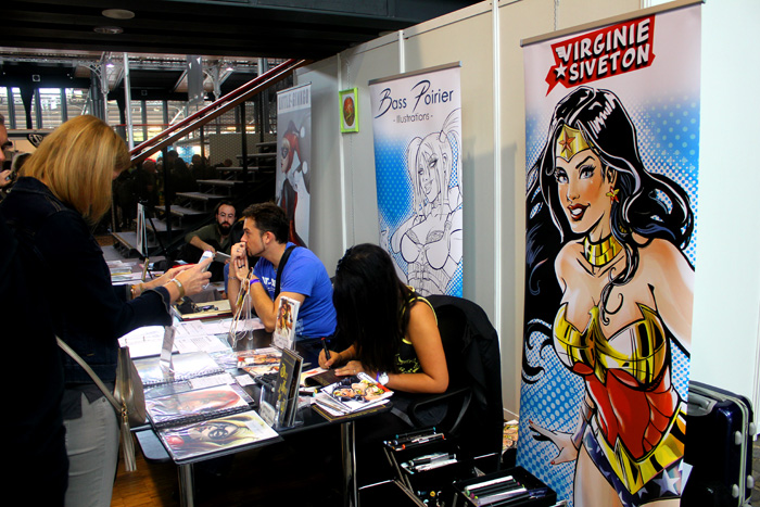 Première constatation, le cadre du Parc de la Villette change une bonne partie de la donne, par rapport aux halls de Villepinte. En compactant les choses mais aussi en les organisant autrement, Reed récupère un sens de circulation plus animé. Là où, dans les Comic Con qui ont précédé, le « village comics » peinait à trouver son identité, avec les auteurs en dédicaces d’un côté et de l’autre les boutiques, sans qu’il y ait réellement interaction entre les deux, l’artist alley est organisée ici en petites zones latérales. Ce qui fait que, bien sûr, au début, il faut trouver ses marques (quand on vous dit que tel artiste est dans l’artist alley, encore faut-il savoir dans laquelle des zones). Par contre l’avantage c’est que – en dehors de la dédicace de Frank Miller, véritablement prise d’assaut, qui a fait l’objet d’un traitement bien particulier mais c’est compréhensible vue la demande – l’essentiel des scénaristes et dessinateurs restaient très abordables. On pouvait discuter assez facilement avec des gens comme Jimmy Palmiotti, Amanda Conner, Bill Tucci et d’autres encore… A noter aussi une « barre » Star Wars avec des gens comme Davide Fabbri, Stéphane Roux, Julien Hugonnard-Bert… C’était un peu plus formel – disons plus « classique » – du côté des dédicaces des stands de Comixology ou Glénat mais Kelly Sue Deconnick (alternant avec Matt Fraction, Elsa Charretier, Pierrick Colinet, Geoff Darrow) distribuait des hugs à volonté à son public.