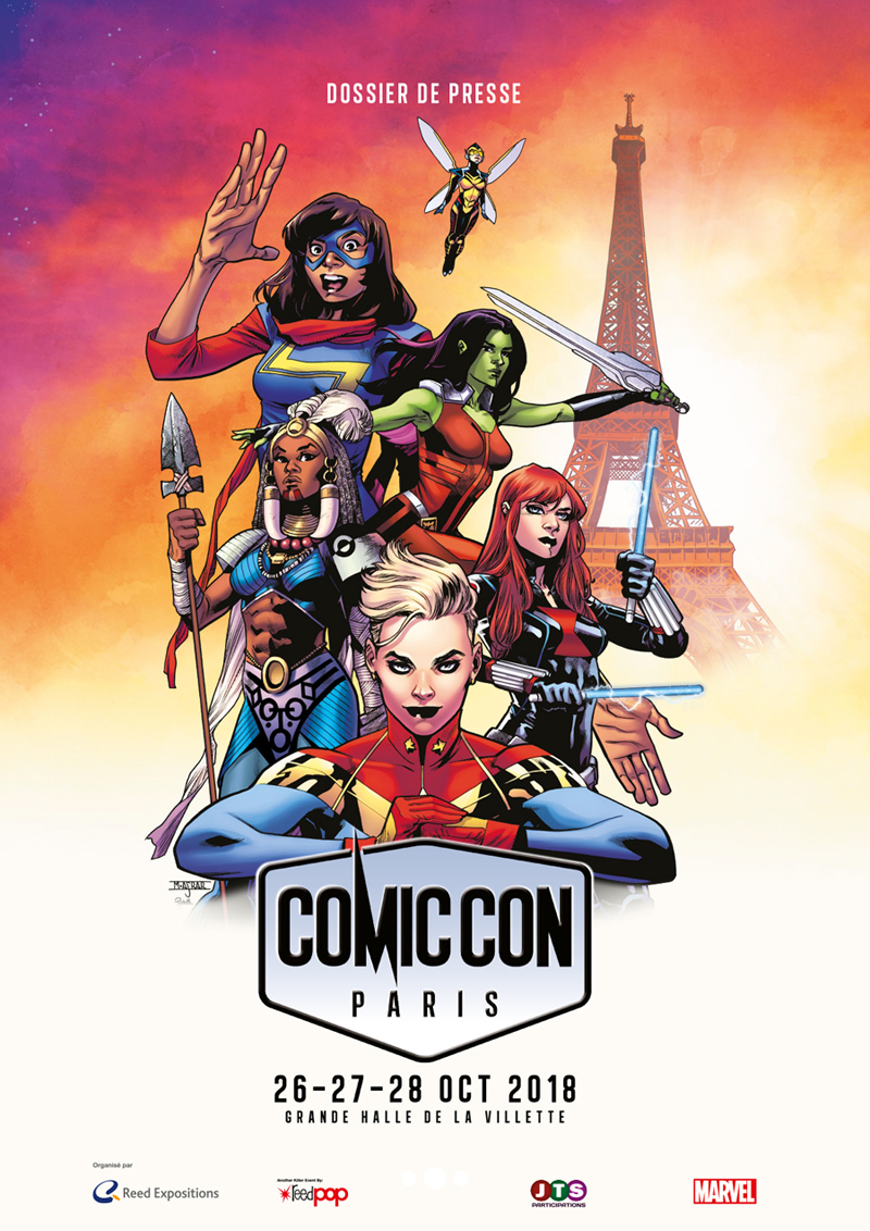 Mahmud Asrar (ancien dessinateur de Supergirl chez DC et aujourd’hui exclusif chez Marvel) signe une affiche 100% féminine. Même si l’équipe du Comic Con surfe sur la vague des super héroïnes au cinéma (comme Captain Marvel prochainement), les journalistes présents ce matin pouvaient noter que l’on compte finalement seulement un petit pourcentage de femmes parmi les invités. Au-delà des posters, il reste du chemin à faire.