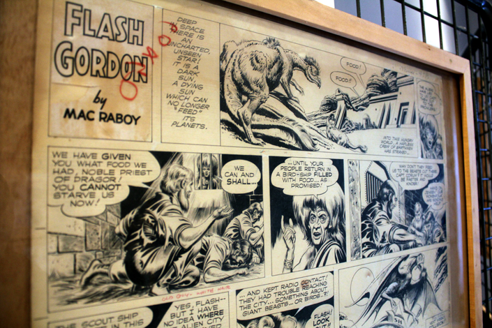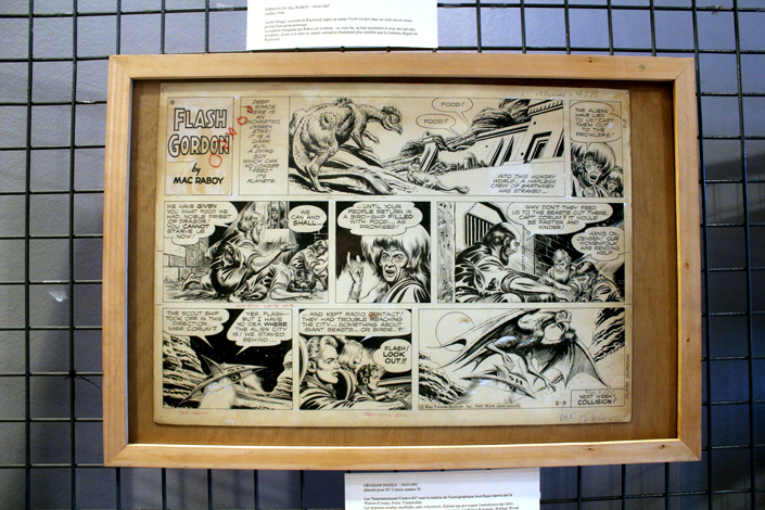 Le lien peut paraître incongru mais Gary Constant, le directeur artistique de Mauvais Genre, est prompt à expliquer qu’après tout il s’agît d’un art bien souvent mésestimé, là aussi « ‘d’un « Mauvais Genre », d’artistes dont le grand public connaît parfois les personnages mais rarement les noms. Le déclic, bien sûr, s’est produit avec l’accès à ces planches, provenant pour l’essentiel de la réserve d’un seul collectionneur privé, visiblement très bien « achalandé ». Le parcours résultant, formé d’une cinquantaine d’originaux, proposait une diversité folle, proposant aussi bien des dessins de Jeffrey Catherine Jones que de Wally Wood. Non seulement on trouvait des styles très différents mais aussi des originaux de configurations diverses (par exemple Foster, qui travaillait chacune de ses cases dans un « format géant ») ou simplement de voir certains artistes non « dilués » dans la postproduction propre aux comics. Par exemple, les dessins d’un Frank Robbins, libérés de la couleur omniprésente des fascicules, rendent plus hommage au talent du maître. Cette exposition rare n’a duré que quelques jours. Il est trop tard pour vous précipiter à la mairie de Tours mais vous trouverez ci-dessous une galerie de photos qui vous donnera une idée de tout ce qui se trouvait réuni.