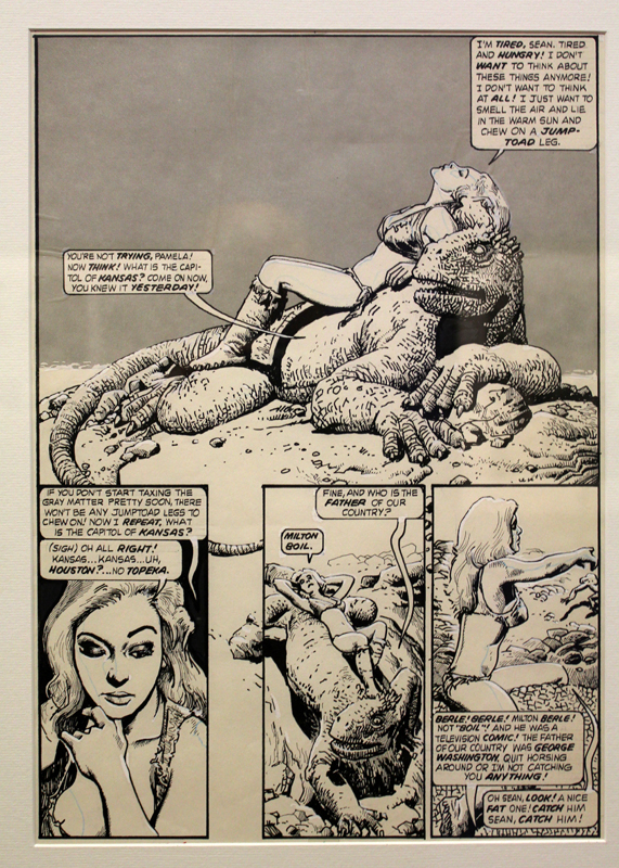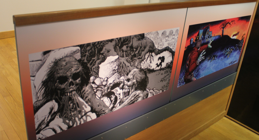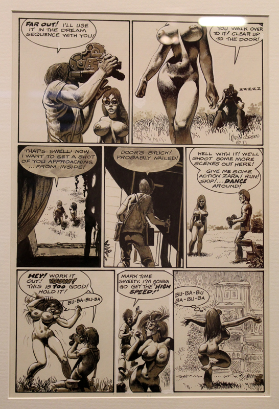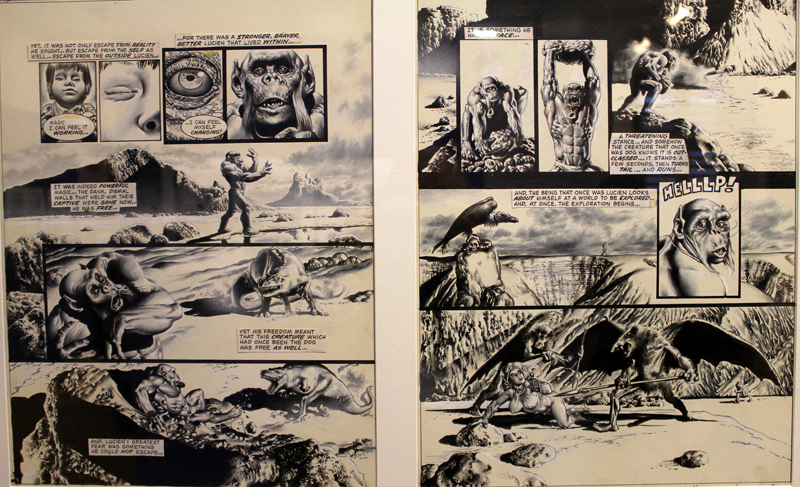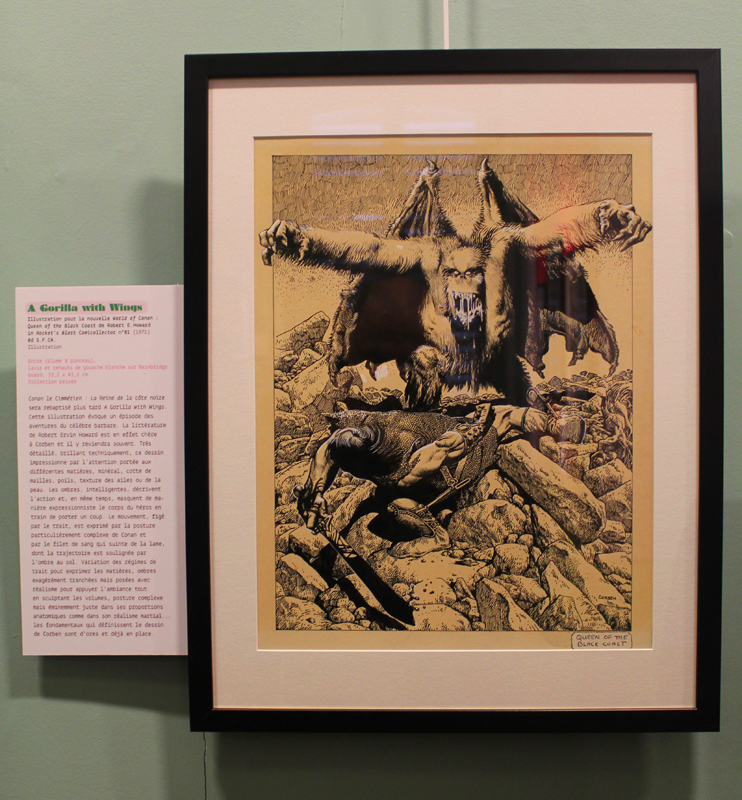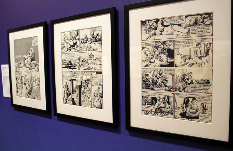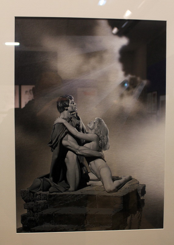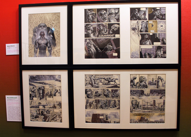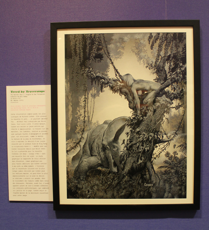 Exposer Corben au musée, cela faisait donc doublement sens ce week-end. Car si la nudité est omniprésente dans les premières décennies du travail du maître, ce n’est pas pour autant que cela veut dire pornographie, comme certains voulaient l’y réduire l’an dernier. Pour preuve un public familial, certes parfois un peu sidéré de découvrir cet univers si particulier. Mais pas forcément choqué. Pour preuve quelques enfants venus avec leurs parents, enfants qui accordaient bien peu d’attention aux monstres et aux pinups mais s’amusaient du côté grotesque de la chose. Bien pensée, l’exposition expliquait en effet de façon très pédagogique le parcours de l’auteur. Elle ménageait aussi une dimension multimédia avec les films d’animations que Corben a pu créer à ses débuts ou encore des statuettes modelées par l’artiste pour lui servir de modèle. Les gamins adoraient cet aspect ludique. Et puis réduire Corben « aux muscles et aux tétons » serait amputer toute une partie de sa carrière de maître du fantastique, avec des visions de vampires, de gorilles ailés, de dinosaures ou encore ses adaptations des romans de Poe. A l’inverse, ceux qui connaissaient, qui avaient pu passer de longue date ses pages, ses couvertures (ses « années Métal » comme expliqué dans l’exposition) avaient de quoi rester bouche-bée devant des originaux devenus depuis des décennies des classiques.