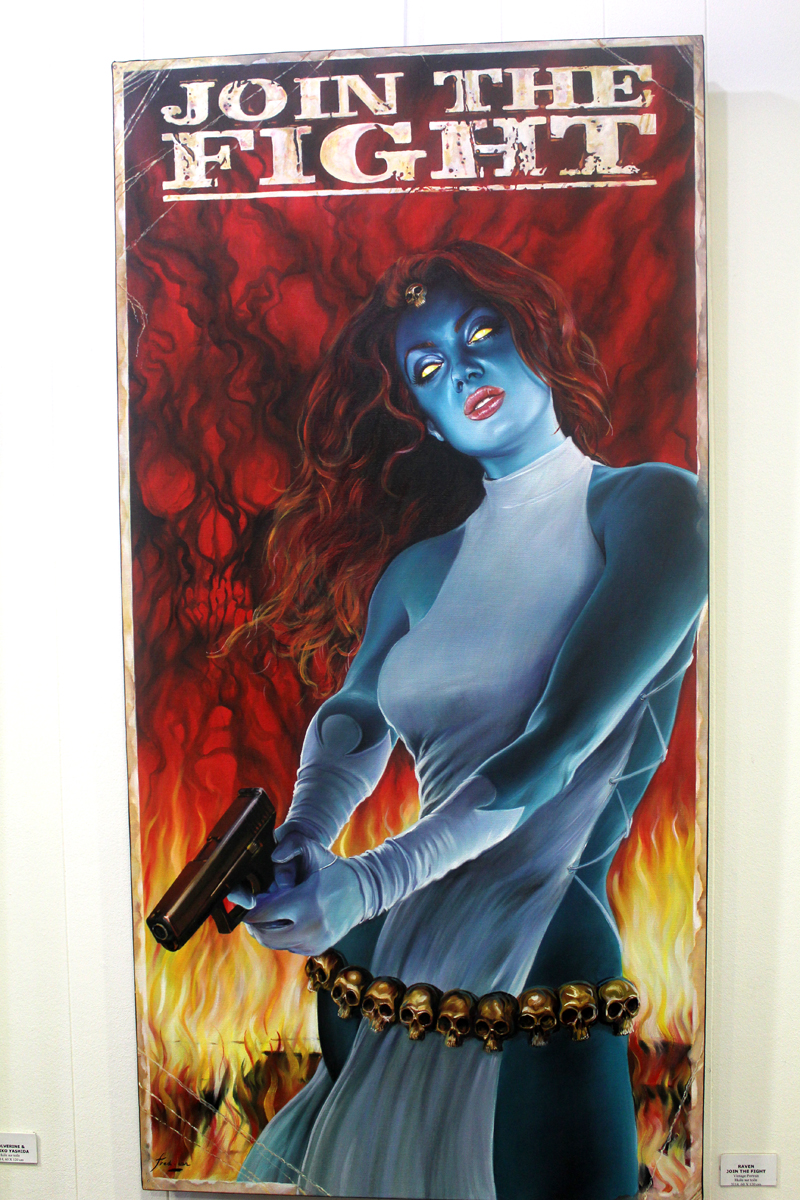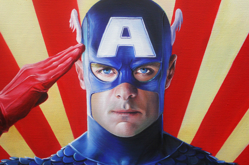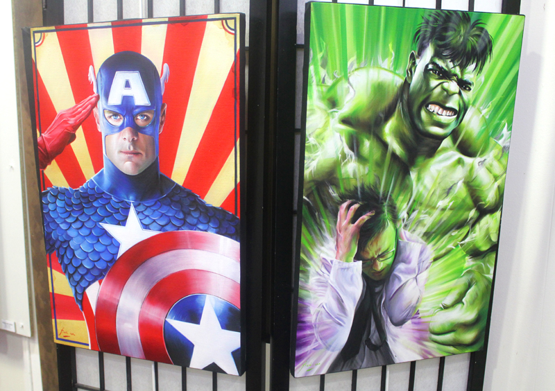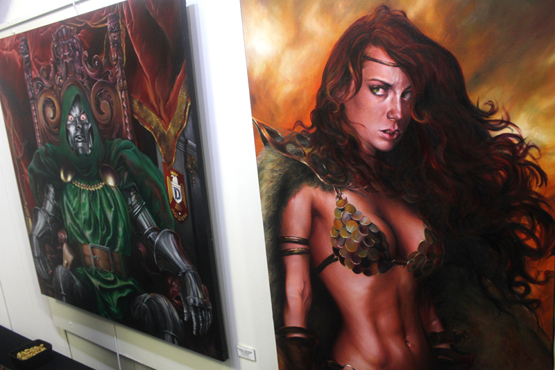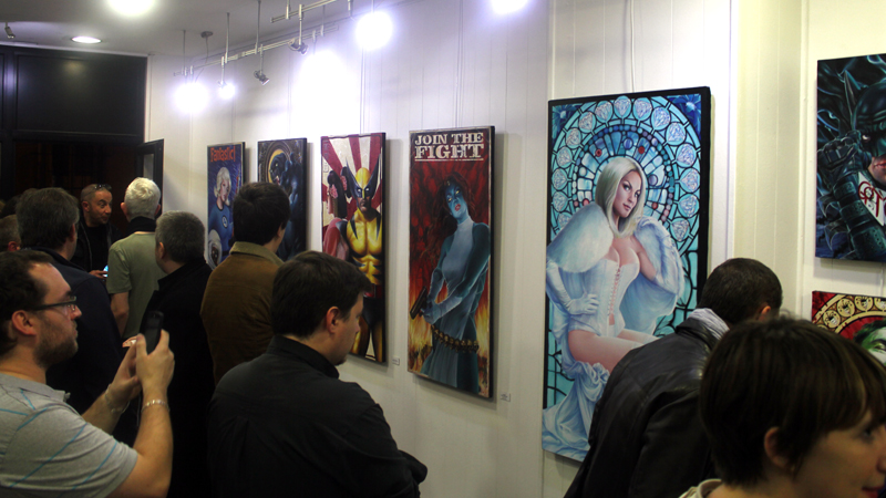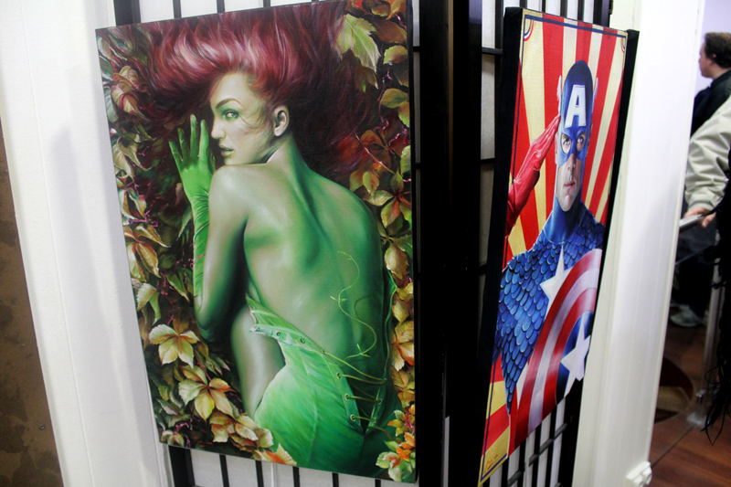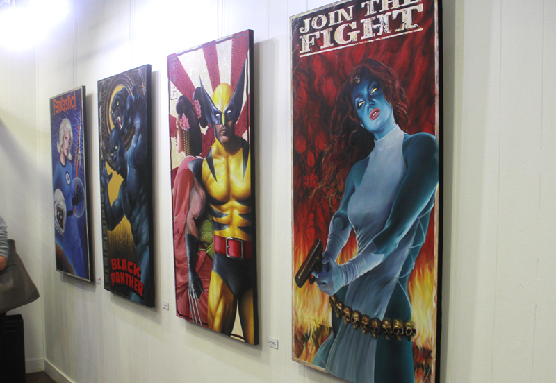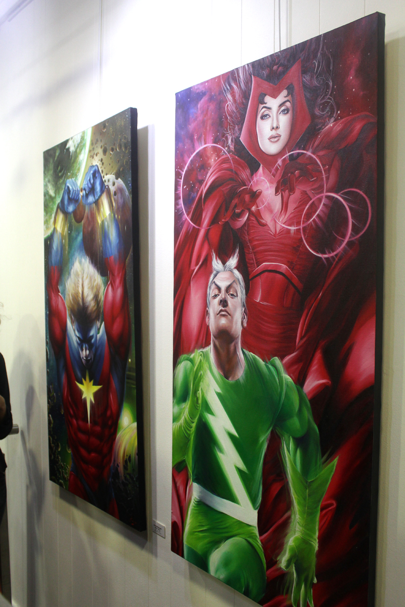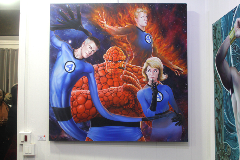 [FRENCH] Depuis jeudi Fred Ian expose à la galerie Carole Kvasnevski (Paris) des tableaux qui ont tous en commun d’être inspirés par les super-héros américains. Si dans l’année écoulée on a pu voir passer des faiseurs qui se contentaient de recopier placidement les maîtres de la BD américaine pour mieux tromper un public de l’Art contemporain qui ne connaît que rarement la source, ici pas de confusion possible. Attention. Ces Captain Marvel, Batman, Fantastic Four ou autres Quicksilver et Scarlet Witch viennent du vrai travail d’un passionné qui, s’il ne s’empêche pas de faire un clin d’oeil au Doctor Doom de John Byrne, créée réellement ses compositions, ses anatomies et ses rendus. Petit aperçu de l’exposition que vous pouvez découvrir à la galerie pendant quelques semaines…
