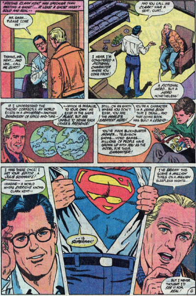 On peut le dire autrement : Clark Kent est encore un peu là, et Superman est presque déjà là. Cet instant on ne peut plus furtif de la transition est alors celui de l’exposition fugace de la sphère intime « sans protection ». Et personne n’y assiste. Personne, vraiment ? Il s’adresse pourtant à quelqu’un. Car c’est l’instant, au fond, où le héros brise le « quatrième mur » – ce mur imaginaire qui, au théâtre, sépare l’espace scénique de celui du public. Et c’est peut-être ce qui en fait sa fascinante singularité. Ce n’est pas pour rien, en effet, que le super-héros crée cette brèche – sitôt ouverte sitôt fermée. C’est – événement rare et précieux du contact improbable entre virtualité et réalité – pour partager brièvement mais sûrement, avec le lecteur/spectateur (et seulement avec lui !), son « super-secret ».