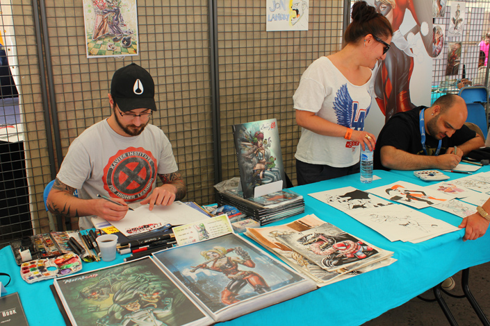 [FRENCH] Le Comic’Gone est terminé, mais il nous reste quelques photos à vous montrer de cette manifestation lyonnaise chaleureuse et conviviale, le deuxième et dernier jour ayant été occupé par encore plus de dédicaces, de cosplay, d’interventions et de discussions de tous ordres. D’Eduardo Rizzo à Will Simpson en passant par Yldiray Cinar, les dessinateurs présents se seront tous montrés d’une grande gentillesse. Côté « artist alley » aussi la disponibilité était de rigueur, certains dessinateurs relevant même le défi de glisser les personnages les plus biscornus dans des sketchcards. A noter qu’à côté du Comic’Gone à proprement parler, la manifestation-mère, Lyon BD, profitait également d’une « vedette américaine » de poids en la personne de Craig Thompson (accueilli, lui, du côté du Palais du Commerce). On n’aura croisé que quelques cosplayeurs ce dimanche mais, que ce soit Shazam, Poison Ivy, Venom, la Fille du Joker ou Two-Face, il y en avait assez pour organiser un concours. Avec la météo qui était, clairement, du côté du festival, le Comic’Gone 2014 s’est donc bien déroulé et… notre petit doigt nous a dit qu’une édition 2015 et d’ores et déjà validée…