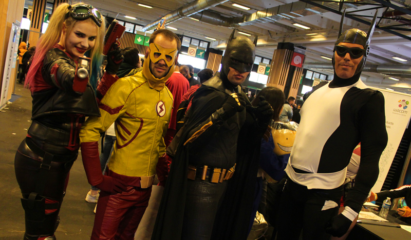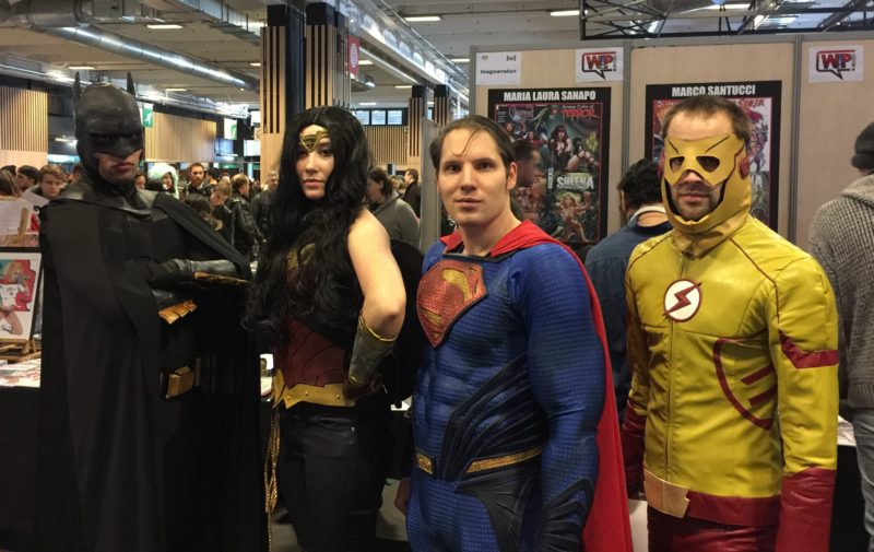 Outre les auteurs déjà annoncés, le reste des conférences repose sur de nombreux spécialistes venus discuter de sujets divers. Les liens entre comics et cinéma, entre comics et manga et bien d’autres choses encore sont discutés à volonté. Ainsi une conférence permet de parler du William Moulton-Marston, le créateur de Wonder Woman, en prévision de la sortie du film My Wonder Women. Plus tard, c’est un vrai panel sur les femmes et les comics (c’est à dire les créatrices mais aussi la représentation des femmes dans la BD) qui réunit Daniela Dimat, Tina Valentino et Maria Laura Sanapo. Cette dernière se révèle vite la vraie meneuse de la discussion. Dessinatrice de DC Bombshells ou Sheena The Jungle Queen, elle lance le débat. Mais ses deux collègues apportent aussi leur pierre à l’édifice. Le dimanche est marqué entre autres choses par une table ronde à l’occasion des 80 ans de Superman. Moment intéressant car sur la scène on retrouve non seulement le journaliste Vincent Brunner (auteur d’un livre sur les super-héros), Marc Duveau (pionnier des livres français sur les comics) et un vétéran : Bernard Trout, l’ancien directeur éditorial de Sagédition et à ce titre celui qui a traduit Superman en France pendant près de quatre décennies. Ce fougueux nonagénaire (!) apporte une perspective pleine d’anecdotes, tandis que les fans modernes sont sidérés par certains détails liés à la censure, à la nécessité de rebaptiser le héros Yordi ou encore à la réaction de Bernard Trout à la mort de Superman, en 1992. N’oublions pas, non plus, la présence de nombreux cosplayeurs parmi lesquels un Flash sidérant (celui de notre image d’ouverture). Non seulement son costume est fidèle mais il a mis au point une gestuelle qui évoque l’accélération. C’est bluffant. A quelques mètres de là un petit garçon le regarde faire… en se demandant à l’évidence si c’est pour de vrai.