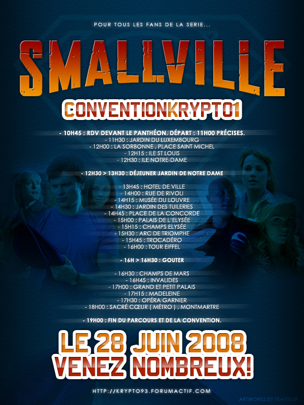 [FRENCH] « Portonaute » diffuse actuellement le communiqué suivant: « Avec les administrateurs du blog et du forum Smallville Krypto93 , nous organisons un grand rassemblement de fans pour célébrer la 7ème saison de cette merveilleuse série . En effet , suite à l’annulation de la soirée Smallville au Festival du Film Jules Vernes Adventure en avril dernier , nous avons décidé de faire plaisir à la communauté en organisant notre propre évènement . Il s’agit donc de la Convention Krypto 1 Smallville ( CK ) qui se tiendra à Paris le 28 juin 2008 dès 11h devant le Panthéon , dans le 5ème arrondissement de la Capitale .