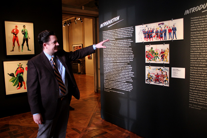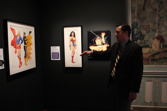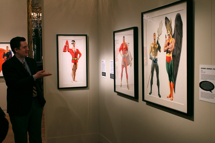 Car, oui, quand on est lecteur de comics on s’engage dans ces salles avec le sentiment d’être en terrain connu. Normal : le commissaire (non, pas Gordon !) de l’exposition, Jesse Kowalski (qui était présent ce matin au Mona Bismarck American Center) a veillé à ne laisse personne à côté de la plaque. Dès le début on ainsi droit à un véritable mur d’orientation qui explique aux néophytes et aux plus jeunes comment s’organise la chronologie des comics (Golden Age, Silver Age…). Une mise au point qui se révèle vite stratégique puisqu’il s’avère qu’il faut expliquer au public qu’Alex Ross prend un plaisir certain à représenter les super-héros dans leur forme la plus iconique. Tel que l’explique lui-même Jesse Kowalski : « Alex Ross refuse de dessiner le Superman moderne qui porte son slip sous ses collants ! ». Non, le Normal Rockwell des comics vise le vintage, l’intemporel, l’indémodable, l’impression de puissance…