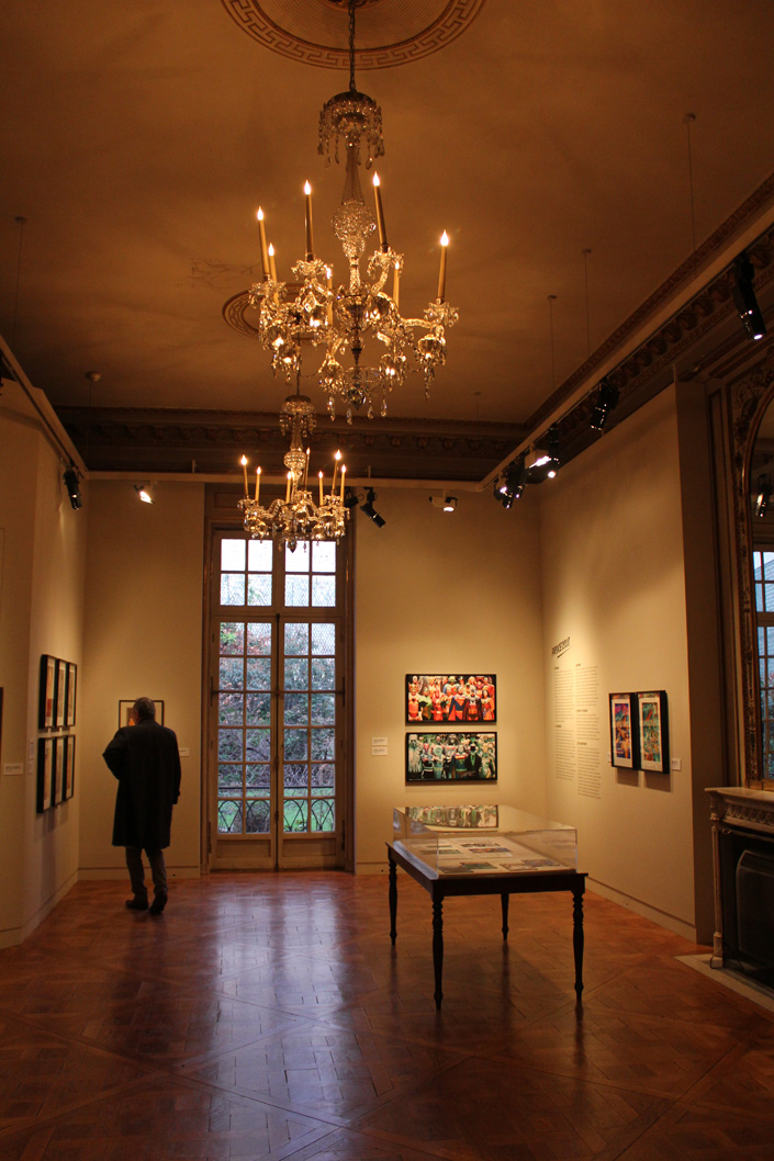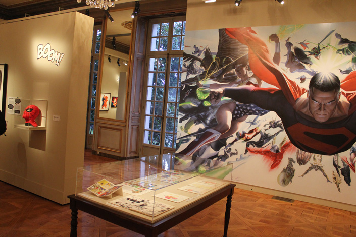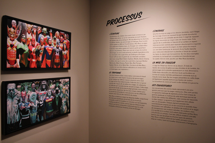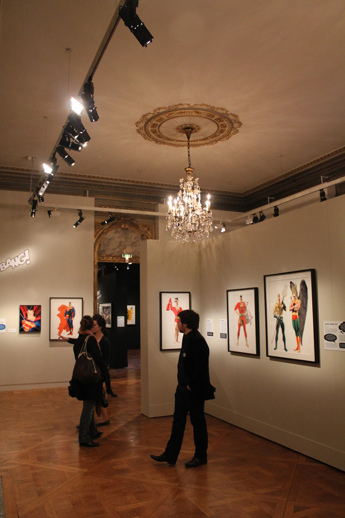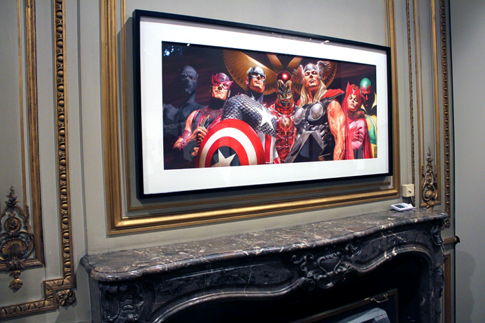 Le cadre du Mona Bismarck American Center se prête assez bien à cette exposition, avec un contraste parfois assez baroque entre les œuvres, les murs, les cheminées et les chandeliers. Mais ça fonctionne tout à fait. Les illustrations d’Alex Ross sont à leur place dans cette ambiance de musée. S’il est vrai que la sélection des images laisse la part belle aux icones de DC Comics, il y a un petit quelque chose qui fait qu’en voyant le portrait de famille des Avengers installé au dessus de la cheminée on se croirait presque dans la Stark Mansion. Ne manquerait guère que Jarvis ! L’expo en elle-même occupe trois pièces, une quatrième (la dernière) se préparant à accueillir des activités pédagogiques sur le thème des super-héros. Jusqu’en juin, l’endroit accueillera aussi diverses conférences ou démonstrations de dessin (ces dernières étant organisées avec le concours du Comicverse). Bref, un petit passage s’impose pour tout fan d’Alex Ross qui se respecte…