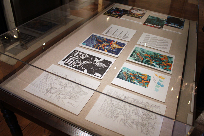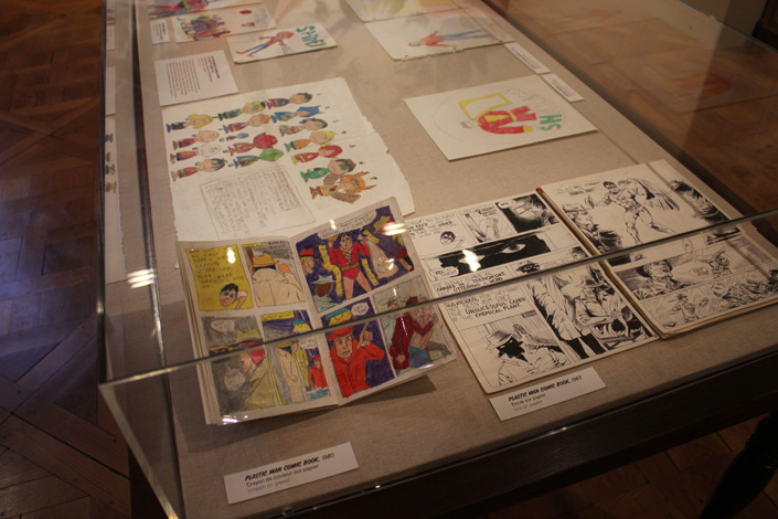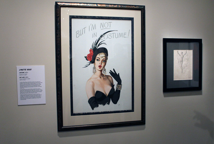 Tout ça, le lecteur d’Alex Ross le sait déjà au moins depuis Marvels, la série qui l’avait mis en orbite il y a deux décennies. Mais l’habitué de sa production trouve ici de quoi s’étonner, avec quelques pièces beaucoup plus rares. L’exposition propose ainsi de découvrir sous vitrine deux numéros des aventures de Plastic Man que le petit Alex a dessiné à l’aube des années 80 (quand il avait une douzaine d’années). Là-bas, contre un mur, une affiche représentant le buste d’une pin-up a l’air beaucoup plus ancien. Normal : c’est l’œuvre de Lynette Ross, la mère d’Alex Ross, qui fut elle-aussi illustratrice. De quoi vérifier que la pomme ne tombe jamais loin de l’arbre tant il y a déjà des choses qu’on retrouve dans les travaux de son fils. A quelques centimètres de là, un croquis ou la même illustratrice a dessiné un costume de femme-vampire. Jesse Kowalski est prompts à souligner que ce dessin date d’avant l’invention de Batwoman par DC Comics. Et comme de bien entendu en vis-à-vis on trouve une peinture d’Alex Ross représentant la Batwoman moderne. Et la boucle est bouclée…