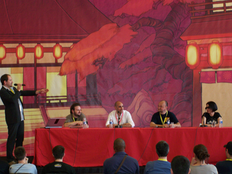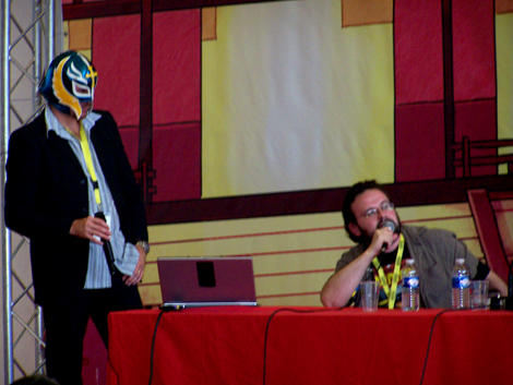 A quelques mètres de là, il y a une « salle de conférence » (hélàs pas véritablement isolée du reste du hall, ce qui promet des bruits de fonds assez tonitruants pour qui veut tenter d’écouter les débats). Bien sûr les discussions tournent le plus souvent autour des BD d’obédience asiatique mais là aussi les comics ne sont pas absents. Jeudi, une conférence sur l’oeuvre de Warren Ellis avait déjà abordé le sujet. Ce vendredi le traducteur/scénariste Ed Tourriol (et « gourou » de Superpouvoir) remettait le couvert pour célébrer « 70 ans de comics » en compagnie d’une belle brochette d’intervenants. D’ailleurs parmi eux Jim Lainé était prompt à souligner qu’on fête surtout les 70 ans de Superman cette année, le premier comic book datant lui de 5 ans plus tôt. Une discussion à bâtons rompus, avec un Edmond Tourriol en « Monsieur Loyal » prêt à tout pour lutter contre la concurrence de la musique (trop forte) des stands proches. Y compris à enfiler la cagoule du catcheur de la WWE « Rey Mysterio » pour se transformer, lui aussi, en super-héros.