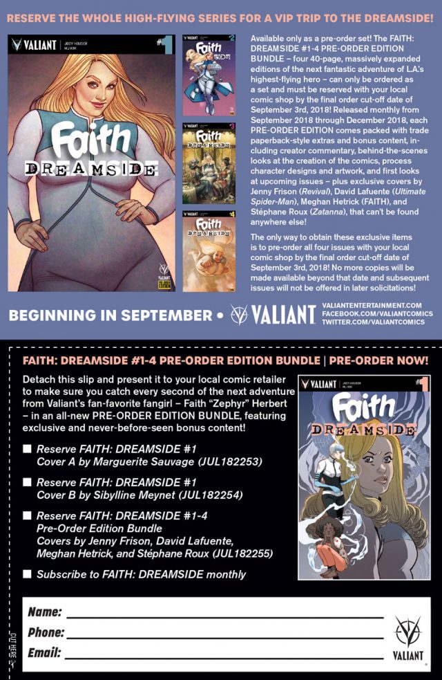 PLUS: There’s still plenty of time to reserve the FAITH: DREAMSIDE #1-4 PRE-ORDER EDITION BUNDLE with your local comic shop before the final order cut-off date of September 3rd! Featuring bonus content and incredible covers by a wealth of talented artists, including Jenny Frison (Revival), David Lafuente (Ultimate Spider-Man), Meghan Hetrick (FAITH), and Stéphane Roux (Zatanna)!