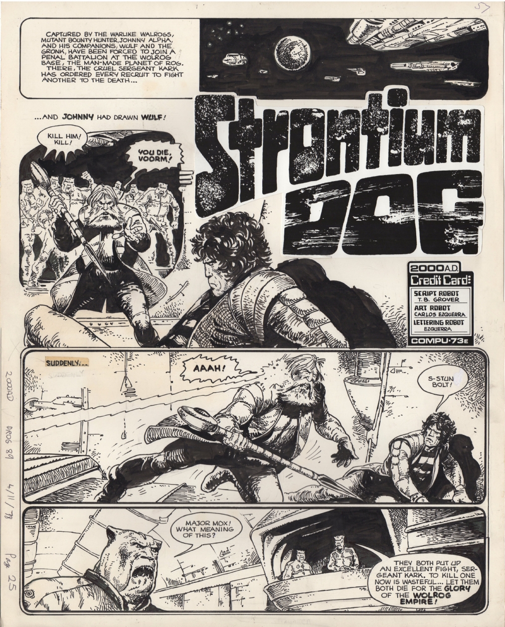 Actif principalement sur le marché de la bande-dessinée anglaise depuis le début des années 70, Carlos Ezquerra avait croisé le chemin de Pat Mills, John Wagner et Gerry Finley-Day tout en spécialisant dans des récits de guerre. En 1977, il se voit confier la mission de designer l’apparence d’un flic futuriste, le Judge Dredd, appelé à devenir la star de la revue 2000 AD. Mais des désaccords internes font que l’équipe créative quitte le titre avant le premier numéro. Ezquerra, à l’origine de l’esthétique du strip, y reviendra cependant rapidement (en particulier à partir de 1982). En 1978, John Wagner et Carlos Ezquerra créé une autre référence de la BD anglaise de science-fiction, le héros Strontium Dog, qui finira par être incorporé à son tour dans 2000 AD. L’artiste a travaillé aussi bien avec Mark Millar (Purgatory) que Grant Morrison (Janus: Psi-Division).