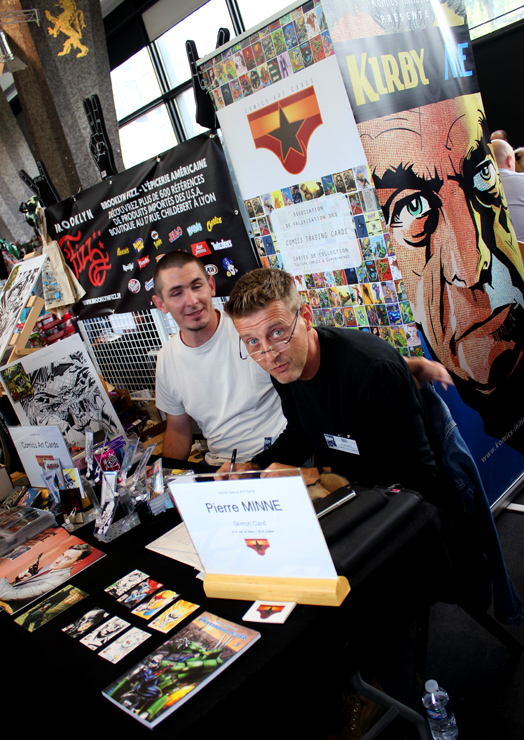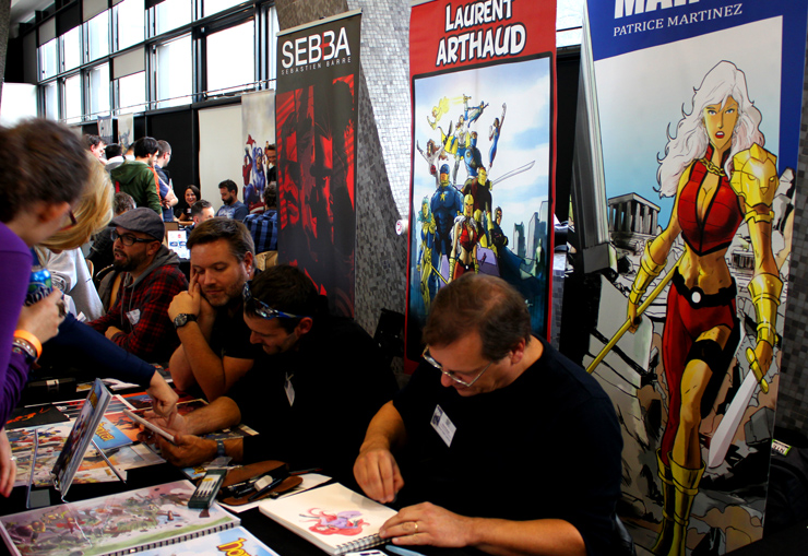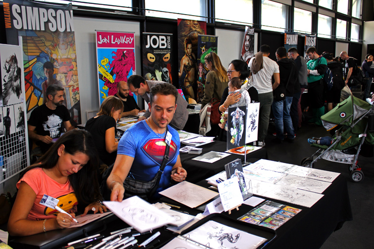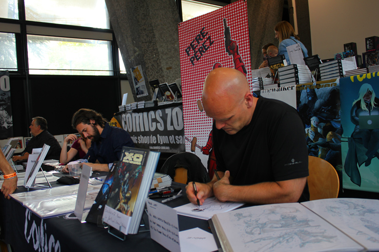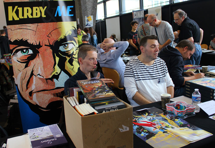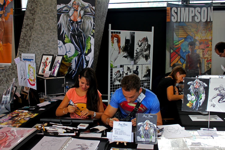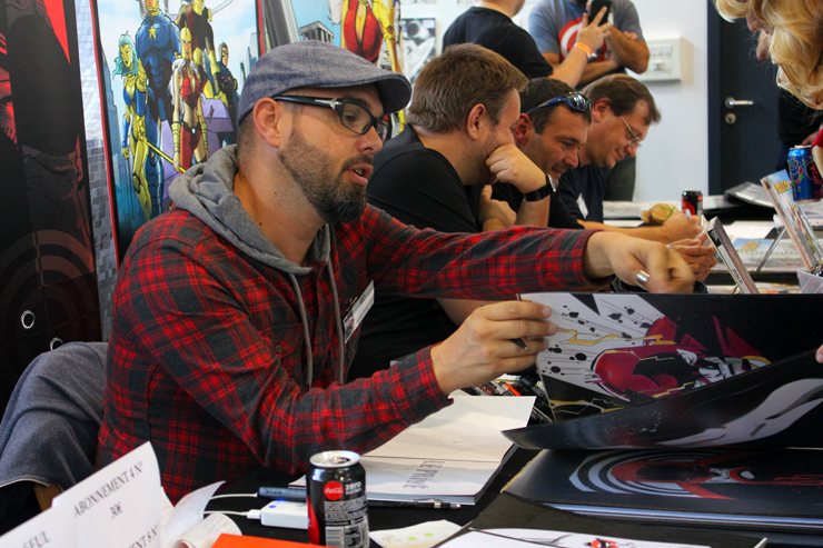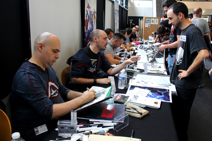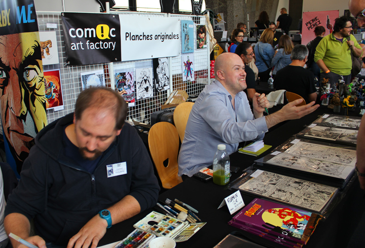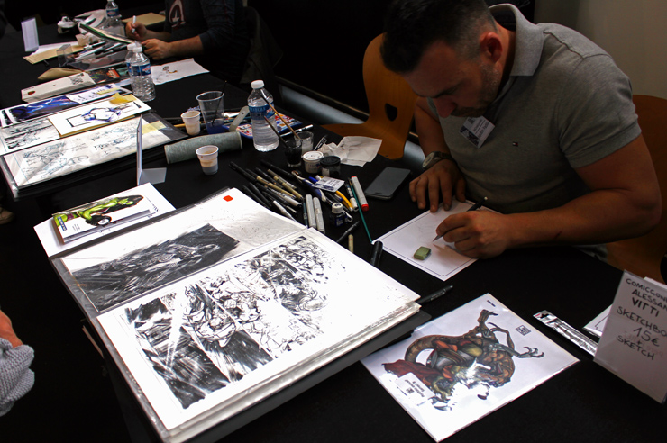 C’est donc un espace plus petit que lors des trois éditions précédentes que l’évènement se déroulait ce week-end. Plus petit, oui, mais qui permettait de réintégrer tous les artistes dans un même hall, qu’ils appartiennent à ce qu’il est convenu de qualifier d’Artist Alley ou qu’il s’agisse de dessinateurs travaillant couramment pour Marvel, DC Comics ou Valiant, le tout laissant aussi de la place à des micro-éditeurs comme Northstar Comics, l’association Comics Art Cards, l’équipe de Non?Si, les superviseurs du livre Kirby And Me ou d’autres encore. Au gré des tables on réunissait donc des signatures telles que Paul Renaud et Daniel Acuna (dessinateurs alternant encore récemment sur les aventures de Captain America), Alberto Jimenez Alburquerque (Letter 44), les facétieux Péré Pérez (Ivar Timewalker, Faith) et Iban Coello (Deadpool & the Mercs for Money), Trevor Hairsine (X-O Manowar), Alessandro Vitti (Iceman) et de nombreux autres visages talentueux. Avec parfois des échanges improbables, comme cet artiste déjà pro de longue date mais ne lisant pas forcément les séries qu’il ne dessine pas, qui se demandait ouvertement quel personnage Marvel dessiner. Réponse de ses collègues et amis : « Tu devrais faire une Gwenpool ». « Gwinpaul ? » L’intéressé ne sachant pas de qui il s’agissait, ses interlocuteurs se lancent alors dans une grande explication qu’il s’agit d’une sorte de fusion entre Gwen Stacy et Deadpool. L’autre éclate de rire et puis demande « Allez, non, sérieux, vous me faîtes marcher, ça ne peut pas exister ? ». La présence d’une cosplayeuse justement déguisée en Gwenpool aura au final valeur de preuve, laissant l’artiste médusé…