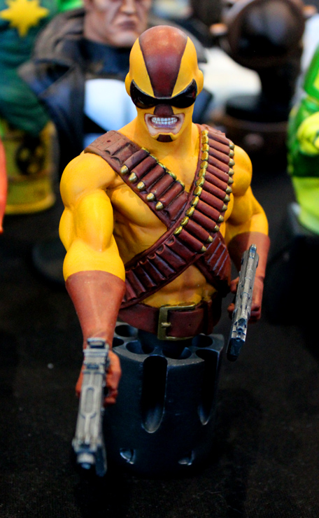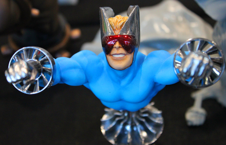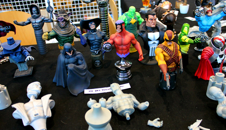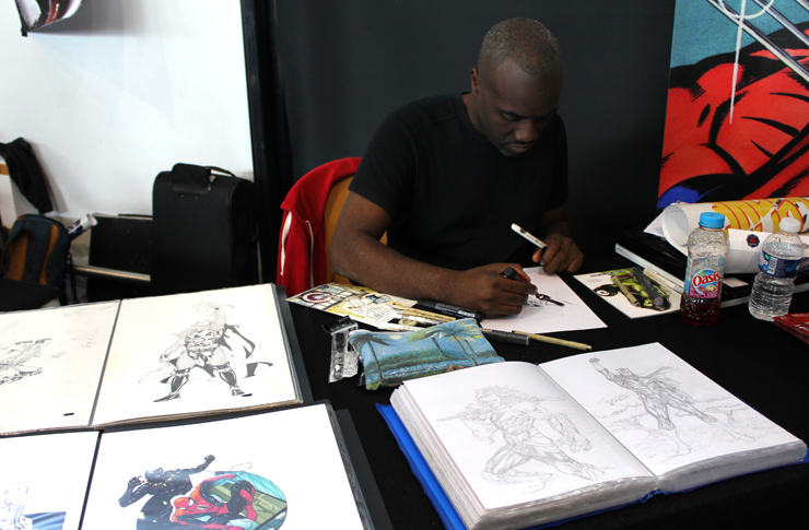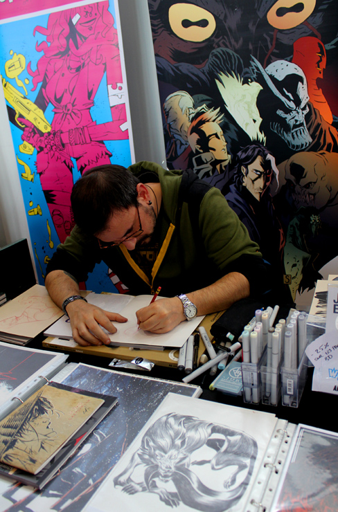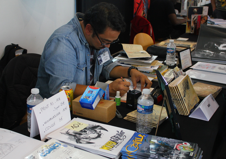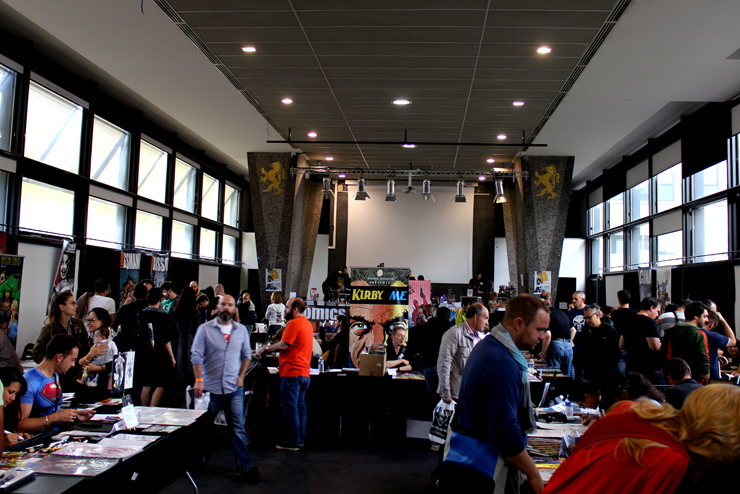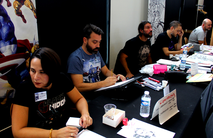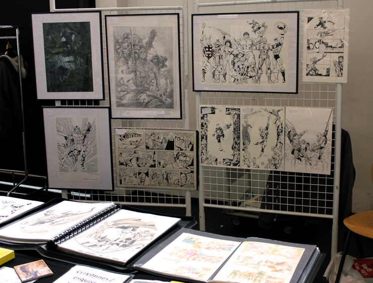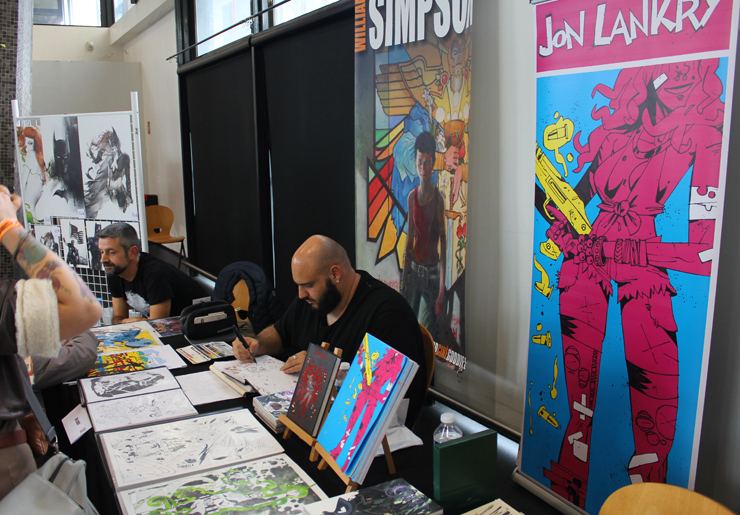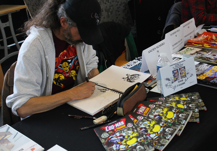 C’est donc un espace plus petit que lors des trois éditions précédentes que l’évènement se déroulait ce week-end. Plus petit, oui, mais qui permettait de réintégrer tous les artistes dans un même hall, qu’ils appartiennent à ce qu’il est convenu de qualifier d’Artist Alley ou qu’il s’agisse de dessinateurs travaillant couramment pour Marvel, DC Comics ou Valiant, le tout laissant aussi de la place à des micro-éditeurs comme Northstar Comics, l’association Comics Art Cards, l’équipe de Non?Si, les superviseurs du livre Kirby And Me ou d’autres encore. Au gré des tables on réunissait donc des signatures telles que Paul Renaud et Daniel Acuna (dessinateurs alternant encore récemment sur les aventures de Captain America), Alberto Jimenez Alburquerque (Letter 44), les facétieux Péré Pérez (Ivar Timewalker, Faith) et Iban Coello (Deadpool & the Mercs for Money), Trevor Hairsine (X-O Manowar), Alessandro Vitti (Iceman) et de nombreux autres visages talentueux. Avec parfois des échanges improbables, comme cet artiste déjà pro de longue date mais ne lisant pas forcément les séries qu’il ne dessine pas, qui se demandait ouvertement quel personnage Marvel dessiner. Réponse de ses collègues et amis : « Tu devrais faire une Gwenpool ». « Gwinpaul ? » L’intéressé ne sachant pas de qui il s’agissait, ses interlocuteurs se lancent alors dans une grande explication qu’il s’agit d’une sorte de fusion entre Gwen Stacy et Deadpool. L’autre éclate de rire et puis demande « Allez, non, sérieux, vous me faîtes marcher, ça ne peut pas exister ? ». La présence d’une cosplayeuse justement déguisée en Gwenpool aura au final valeur de preuve, laissant l’artiste médusé…